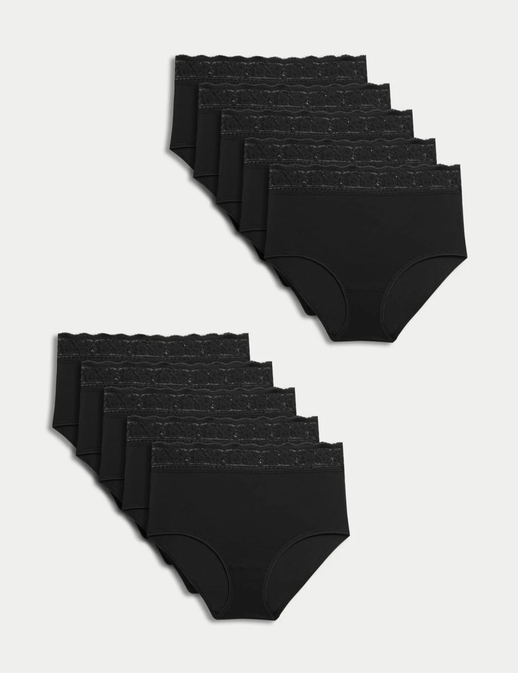 Stock up on comfy essentials with these cotton-rich knickers. Full brief style for comfortable coverage, with added stretch. Includes 10 pairs, each with a pretty lace-trimmed waist. M&S Collection: versatile styles in modern shapes with unique and playful details.