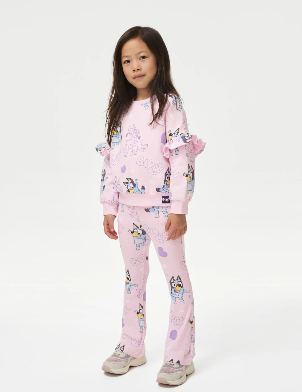 Bring a touch of Bluey™ fun to their wardrobe with this cotton-rich outfit. Comfy regular fit. Two-piece set includes a round-neck top and a pair of flared leggings made from stretchy ribbed fabric. Frilled trims on the long sleeves add a pretty touch.