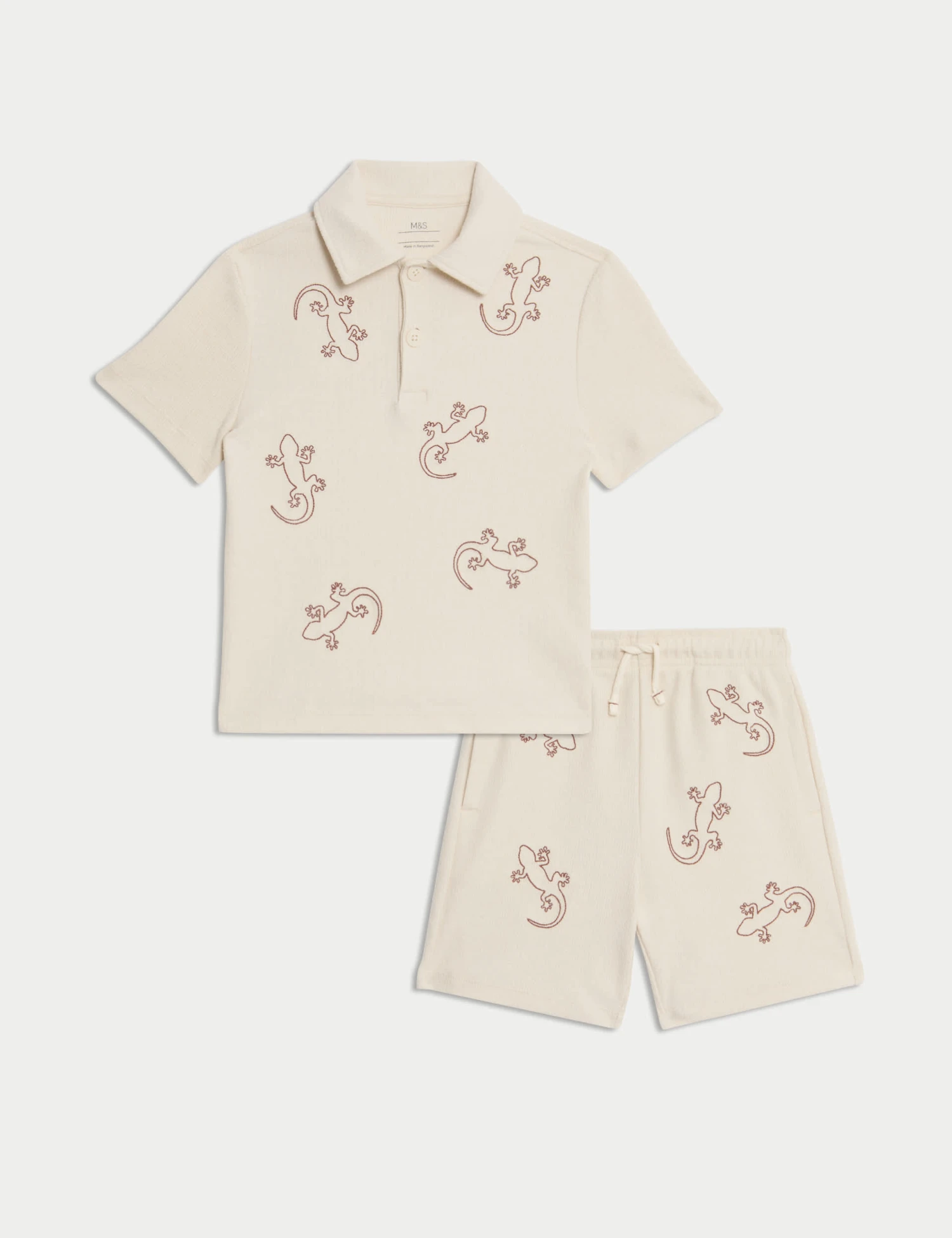 This cotton-rich outfit is perfect for their next adventure. The short-sleeved shirt features a button-down collar and is embroidered with friendly geckos. The co-ordinating shorts have a comfy elasticated waist and a secure drawstring fastening.