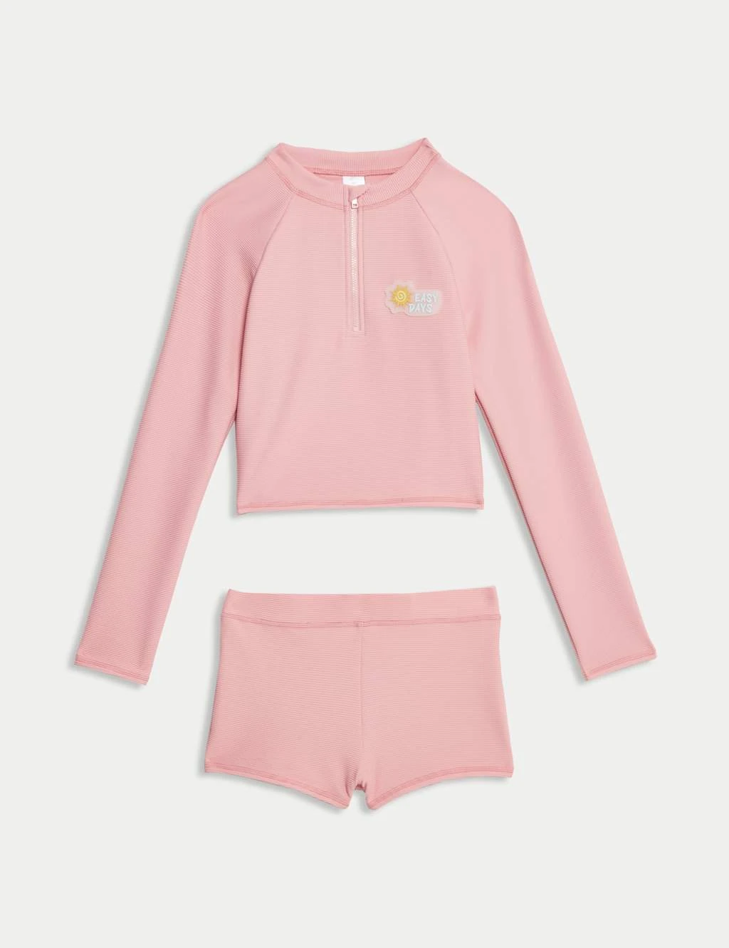 Kids can make a splash in this two-piece swim set. The long-sleeved rash vest features a half-zip fastening at the neck for easy dressing. A fun badge on the chest reads ‘Easy days’. Matching swim shorts have an elasticated waistband for a comfy fit. Added stretch and a lining ensure extra comfort. A pretty floral print completes the design.
