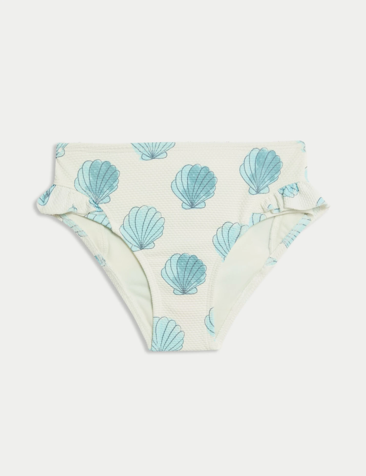 This sweet two-piece swimsuit features an all-over shell print that’s perfect for seaside trips.The set includes a square-neck top and a pair of bikini bottoms. Added stretch ensures active kids can move around easily. They’re lined for extra comfort, too.