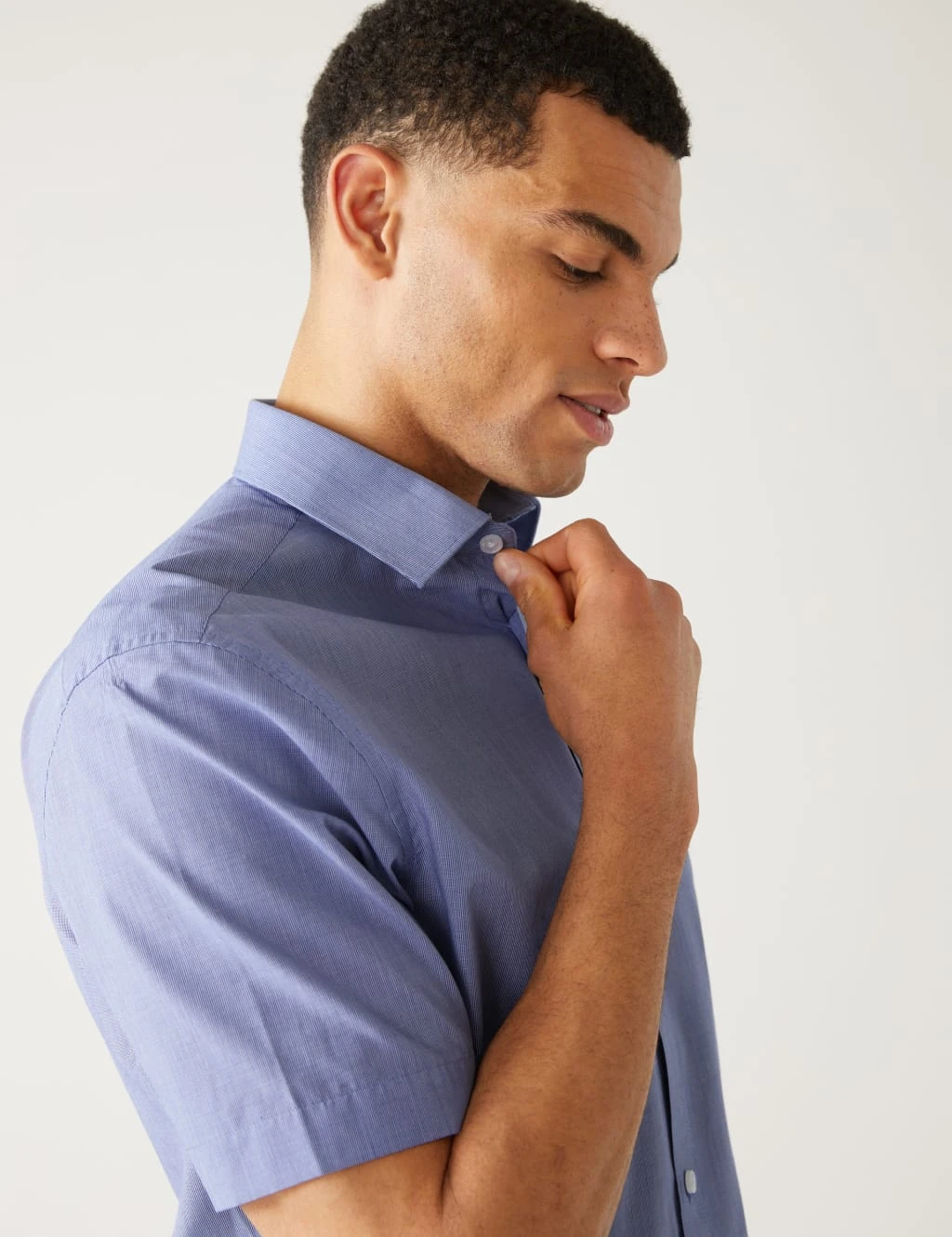 These short-sleeved shirts are made from a crisp cotton-blend fabric that lets your skin breathe. Comfy regular fit, with a classic collar. Pack has one semi-plain shirt and one with a subtle geometric pattern. Our easy-iron finish makes your new shirts simple to care for.
