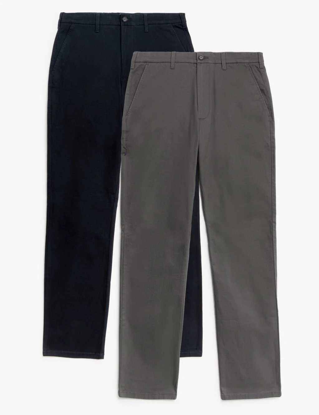 These cotton-rich stretch chinos are ideal for work or weekend looks. Handy two-pack, both designed in a classic regular fit with added stretch for unrestricted movement. We only ever use responsibly sourced cotton for our clothes. M&S Collection: easy-to-wear wardrobe staples that combine classic and contemporary styles.