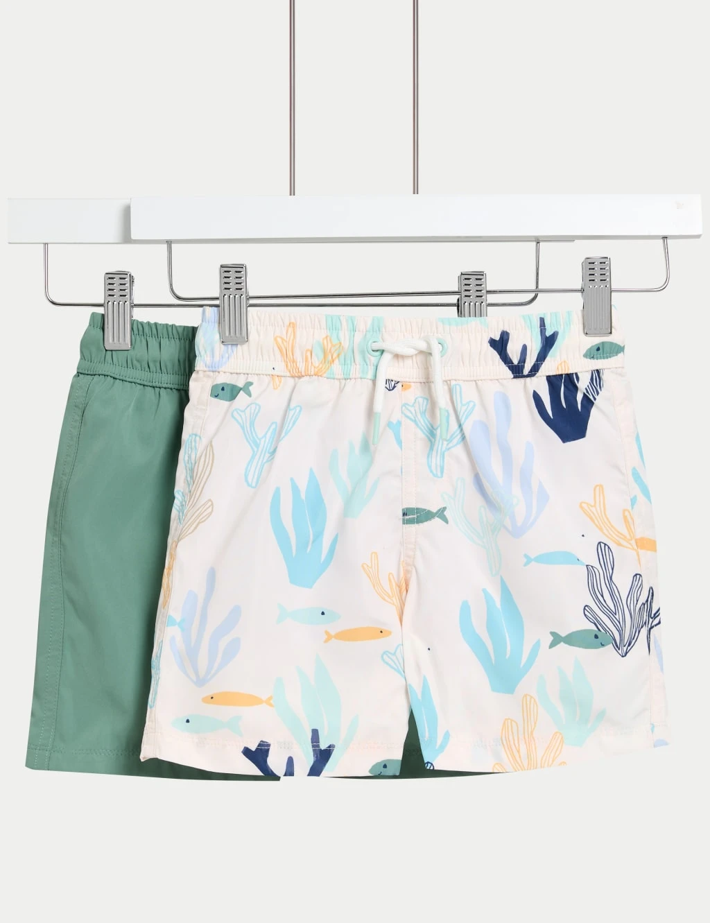 Get them set for fun in the sun with this handy two-pack of shorter length swim shorts. Regular fit, with a comfy elasticated waist and a drawstring fastening for easy adjustment. Includes a plain pair and one with a sea scene print.
