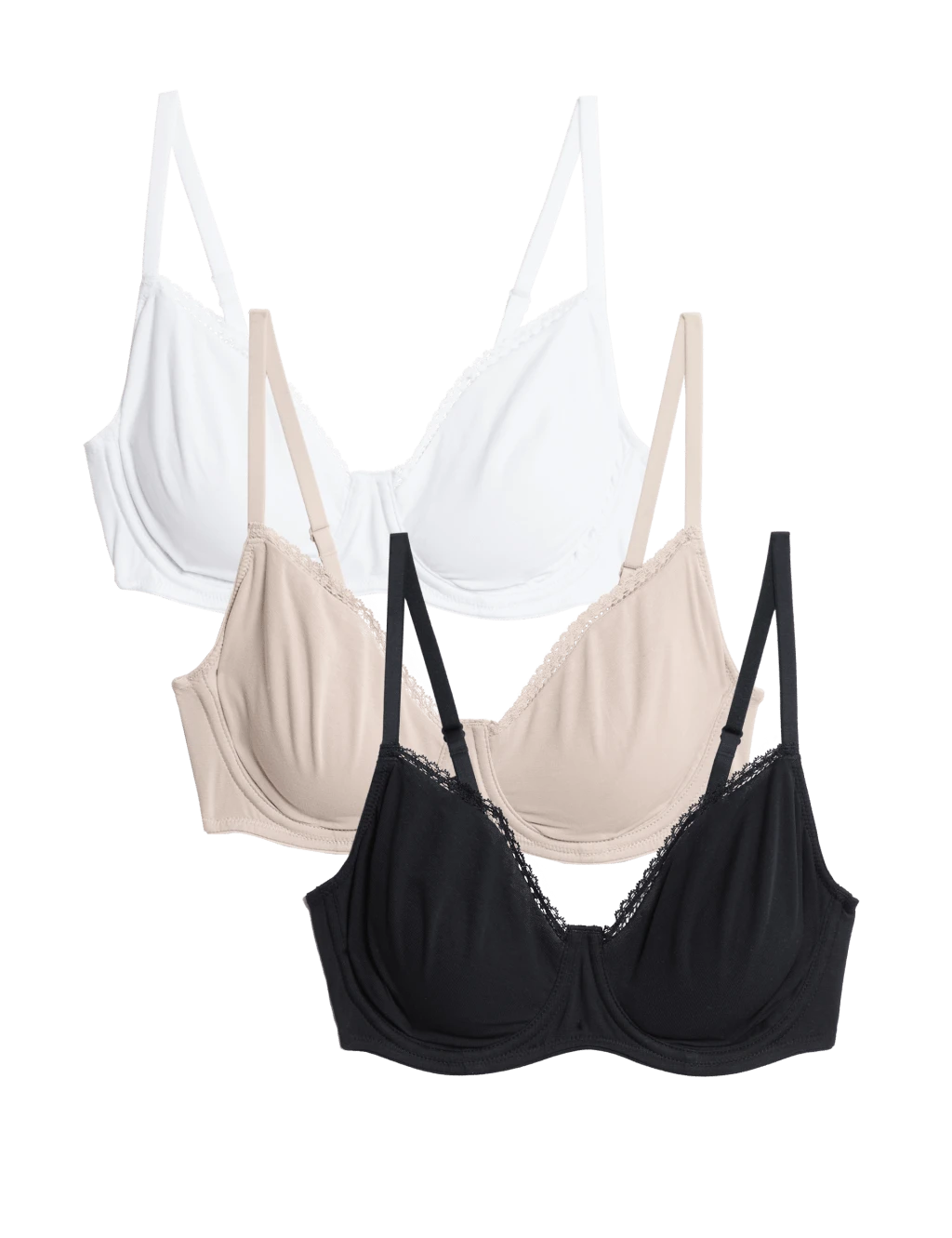 This handy three-pack of cotton-rich bras will keep your daily essentials stocked up. The underwired, full cup design provides complete comfort and support, and is non-padded for a natural silhouette. A lace trim creates a feminine finish. M&S Collection: versatile styles in modern shapes with unique and playful details.