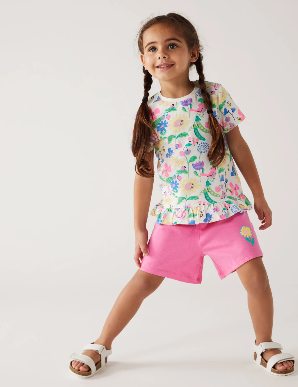 Kids will always be ready to enjoy warm days with these pure cotton shorts. Comfy regular fit. Pack of three pairs includes one with a colourful garden print, one with a flower graphic and one plain design.