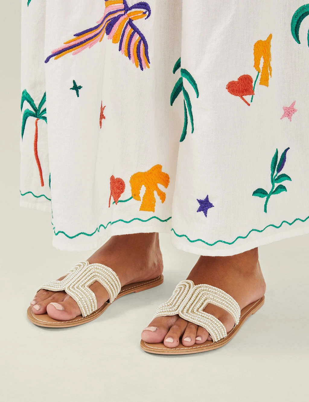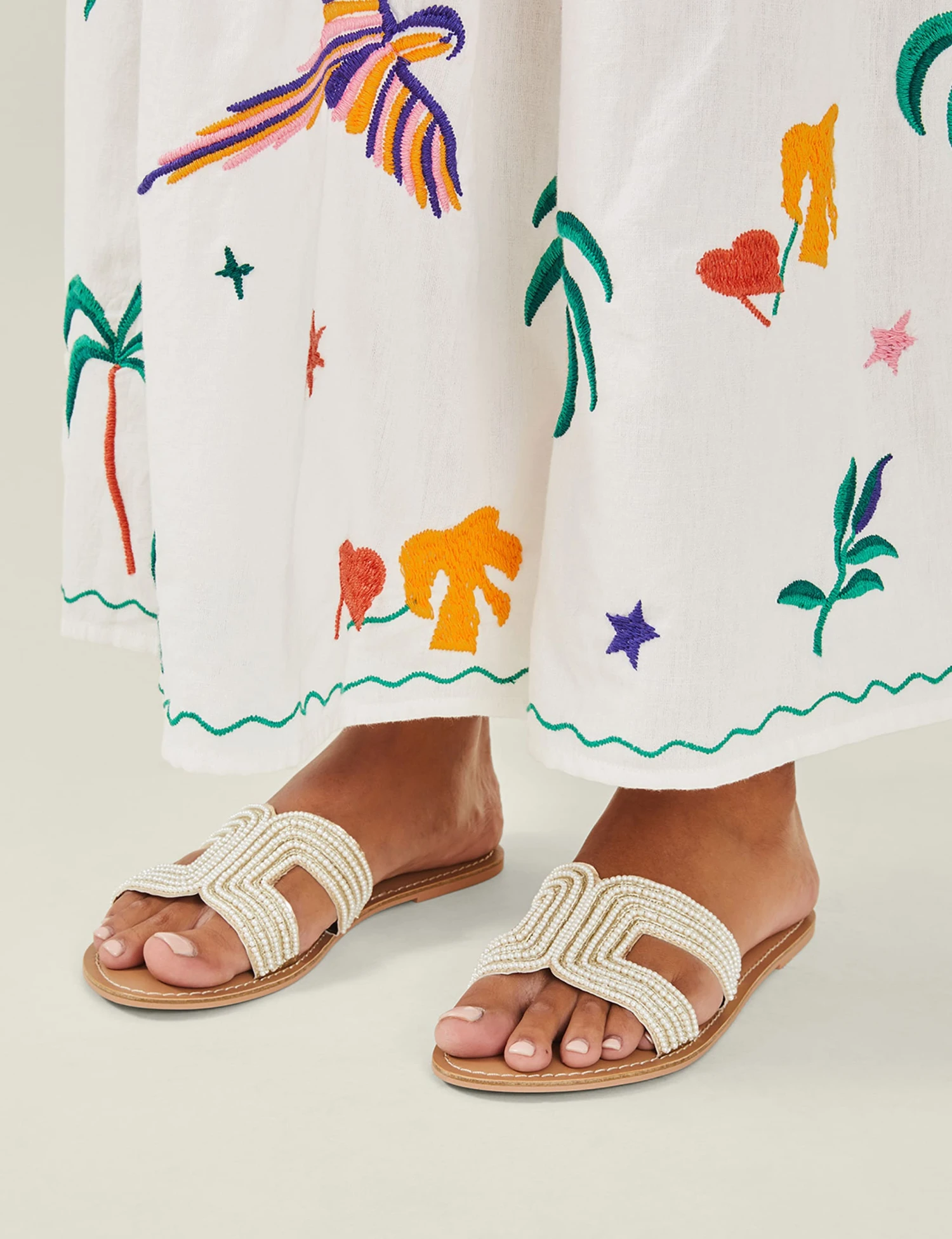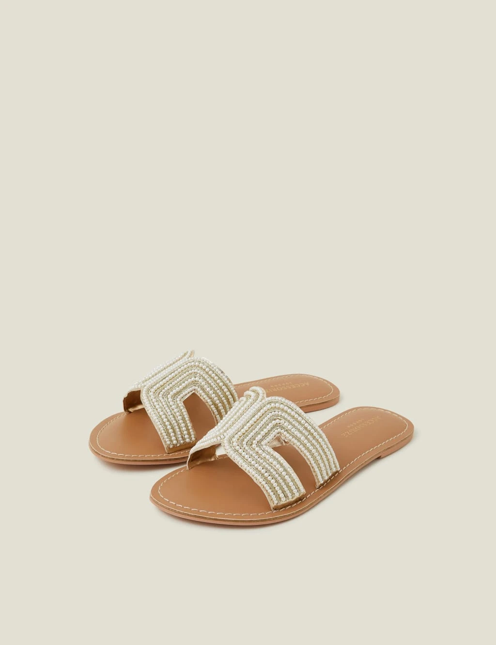Perfect your resort look with these chic beaded sliders from Accessorize. The slip-on style features a practical flat sole and a slightly padded footbed, making them ultra-comfortable for long seaside strolls. Metallic stitching and faux pearl embellishments on the front strap ensure a glamorous finish.