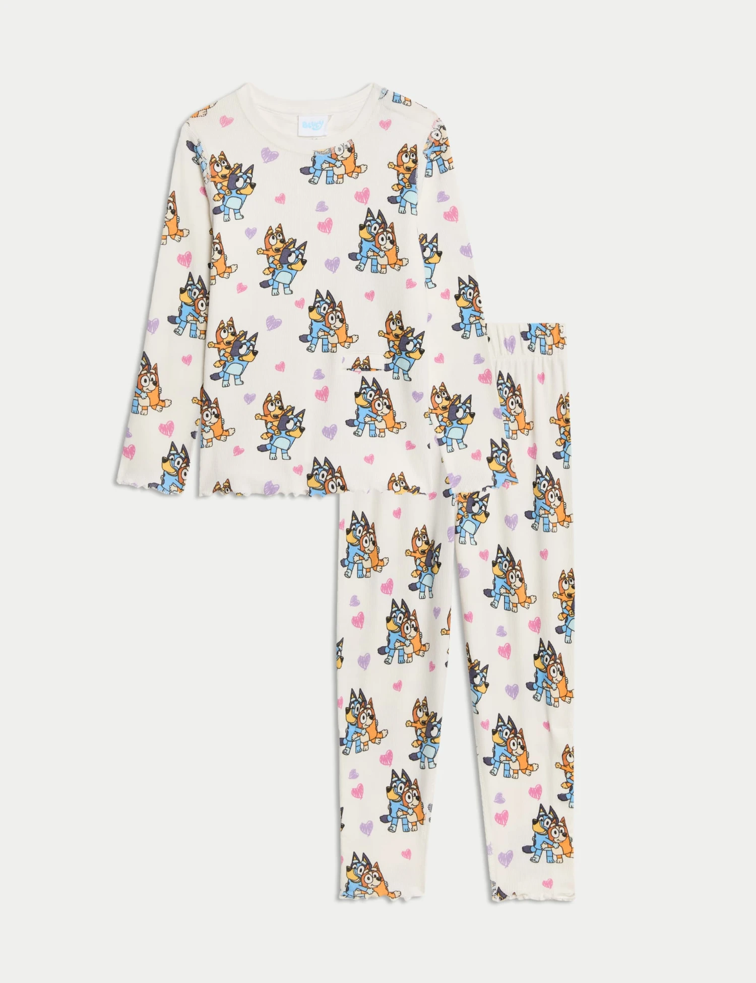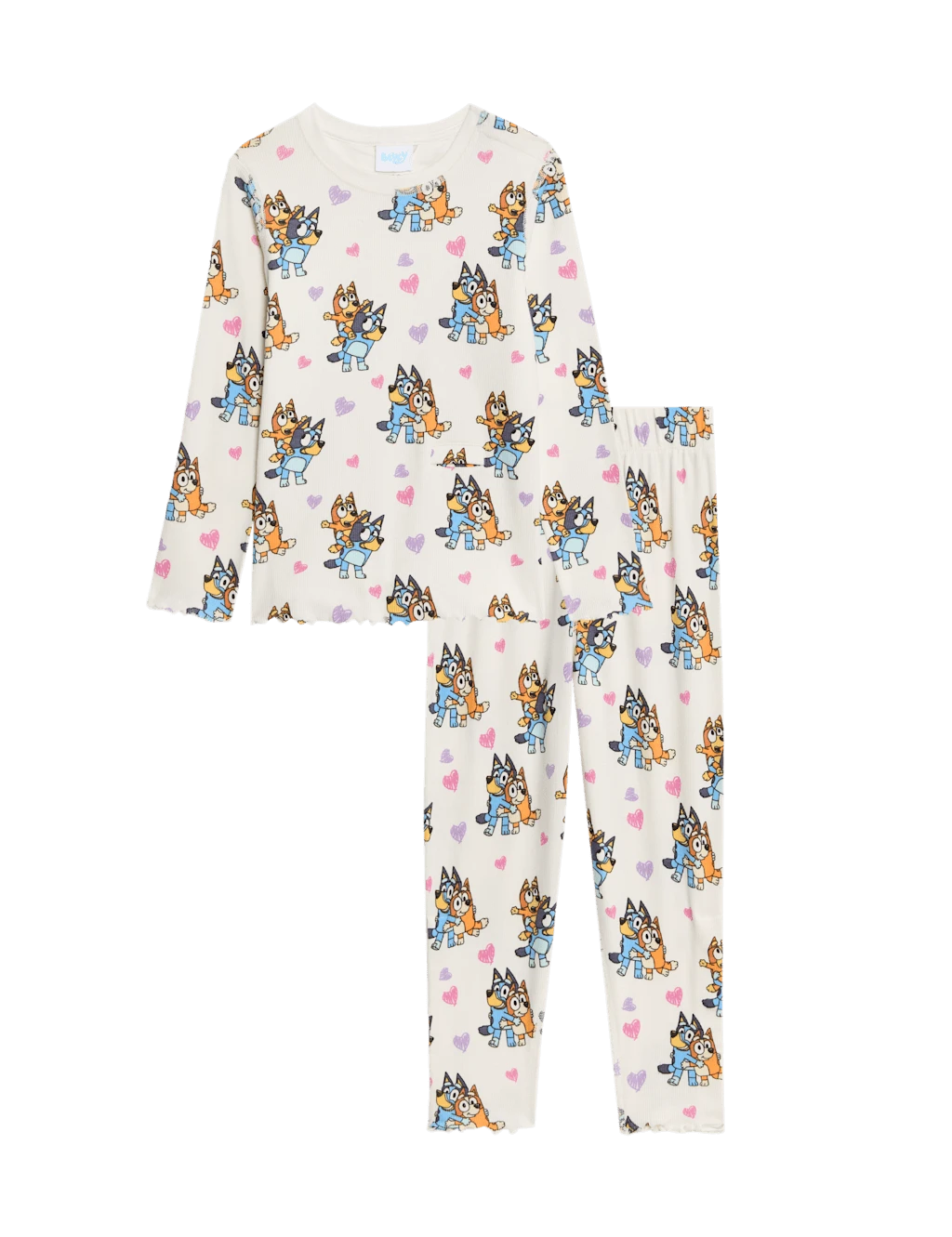 These ribbed cotton-rich Bluey™ pyjamas are a fun choice. Regular-fit set. Long-sleeved top with poppers at the shoulder and a feeding tube opening. Full-length, pull-on bottoms. Hidden care labels and flat seams for comfort. Pretty lettuce hems.