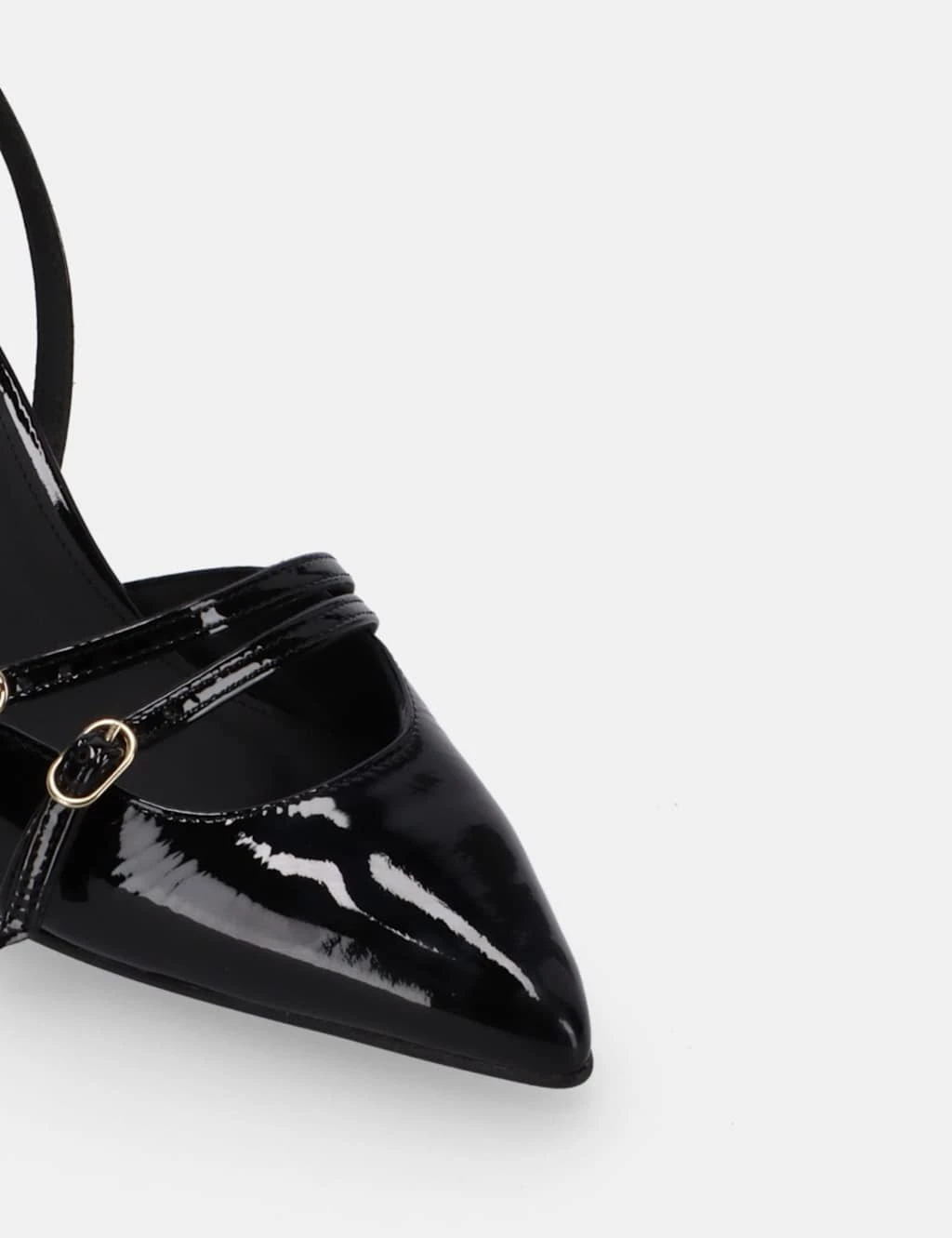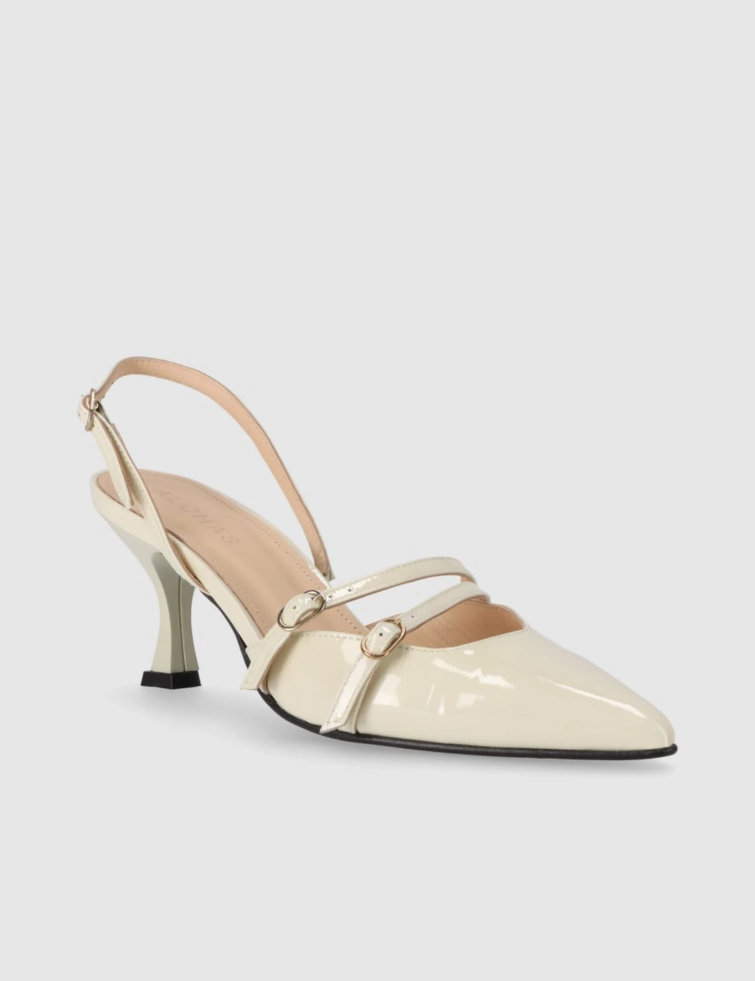 Step into understated glamour with the Joelle Onix slingbacks from Alohas. They’re crafted from glossy patent leather, with a pointed toe and mid-kitten heel creating an elegant silhouette. Two straps at the front and a slingback strap feature adjustable gold buckles for the perfect fit.