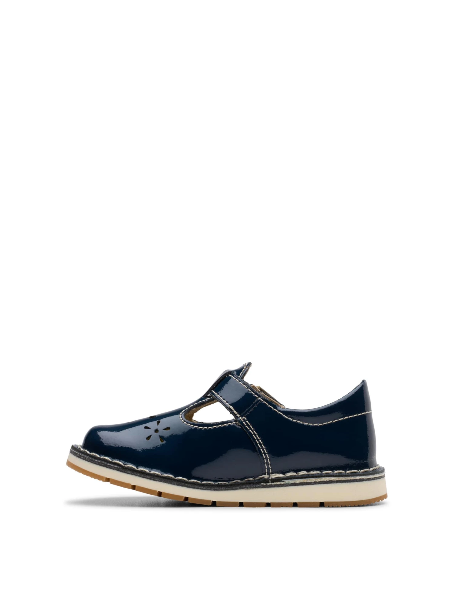 With their glossy patent leather and smart T-bar design, these Clarks first shoes are both practical and stylish. The buckle fastening is quick to do up and has a choice of positions for a better fit. A cut-out design on the upper creates a pretty look.