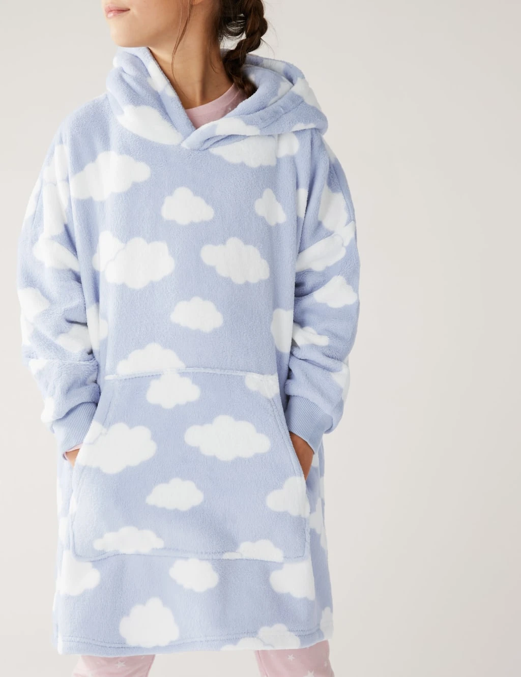 Wrap them up in this cosy cloud print hoodie for blanket-like warmth on chilly days. Comfy oversized fit for easy layering. Kangaroo pocket for storing treasures or keeping little hands toasty. Made with recycled polyester.