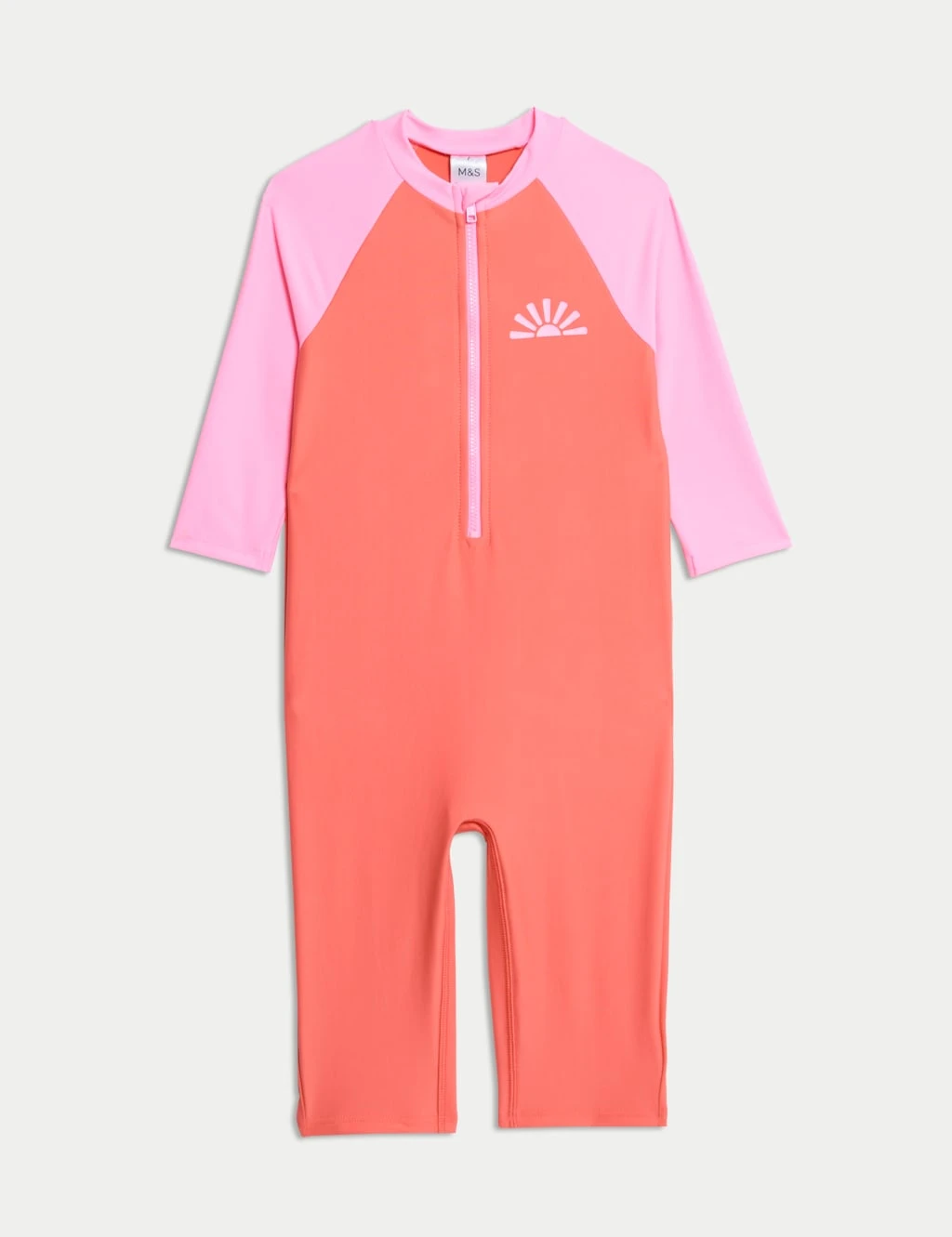 Get your youngster ready for fun in the water with this all-in-one swimsuit. Regular fit, with a practical front zip fastening and neat three-quarter sleeves. Added stretch in the fabric ensures easy movement. Its vibrant colourblock design is complemented by a small sunrise graphic on the chest.