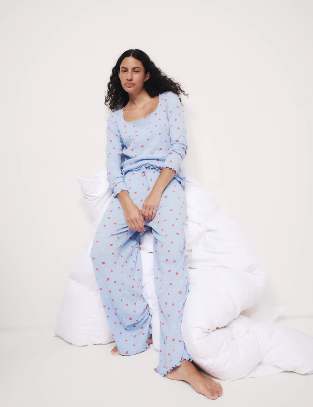These printed, ribbed pyjamas are crafted from a soft cotton modal blend with Cool Comfort™ technology, making them perfect for warmer nights. Regular-fit set includes a long-sleeved top and long bottoms. Scoop neckline and lettuce trims create a feminine feel. M&S Collection: versatile styles in modern shapes with unique and playful details.