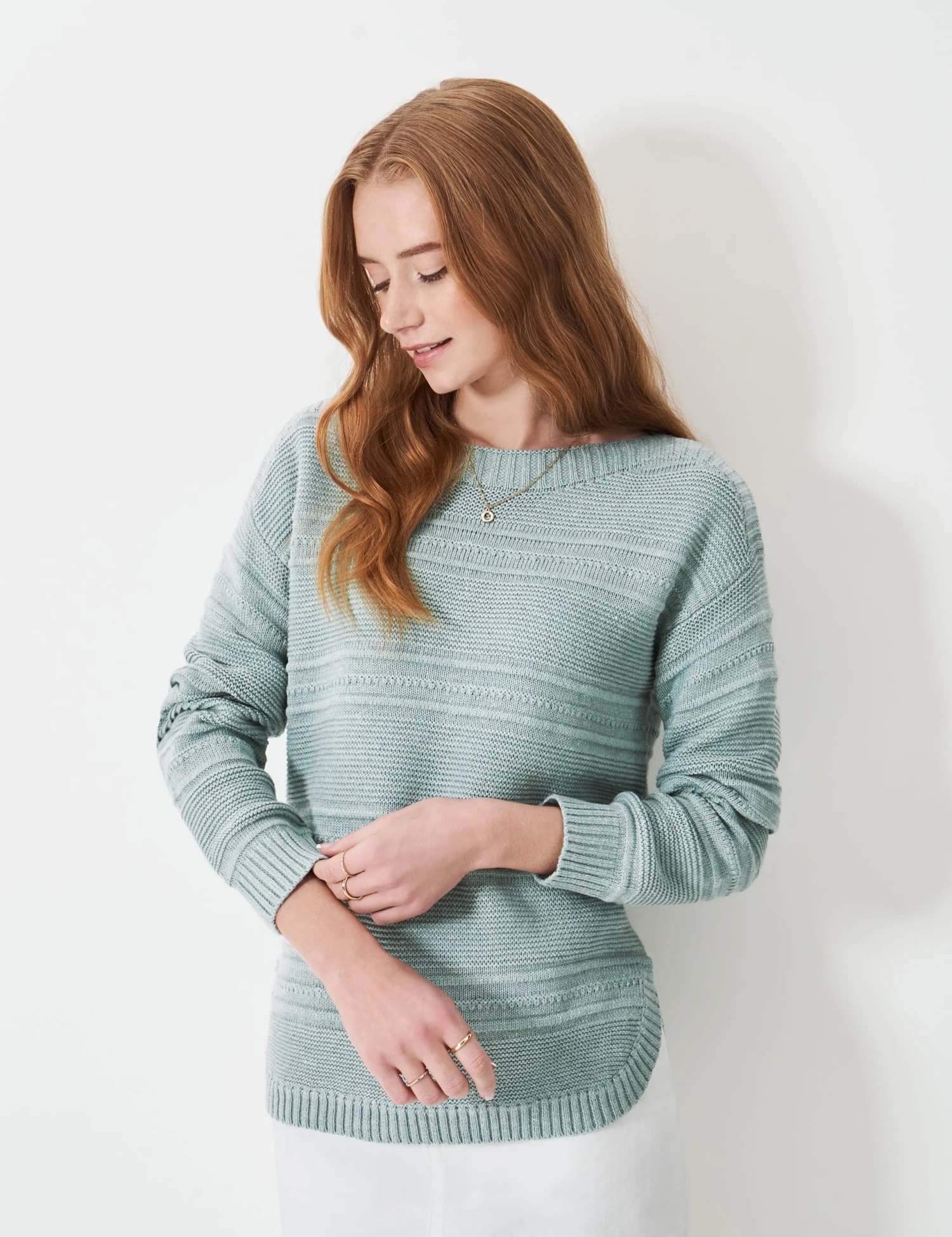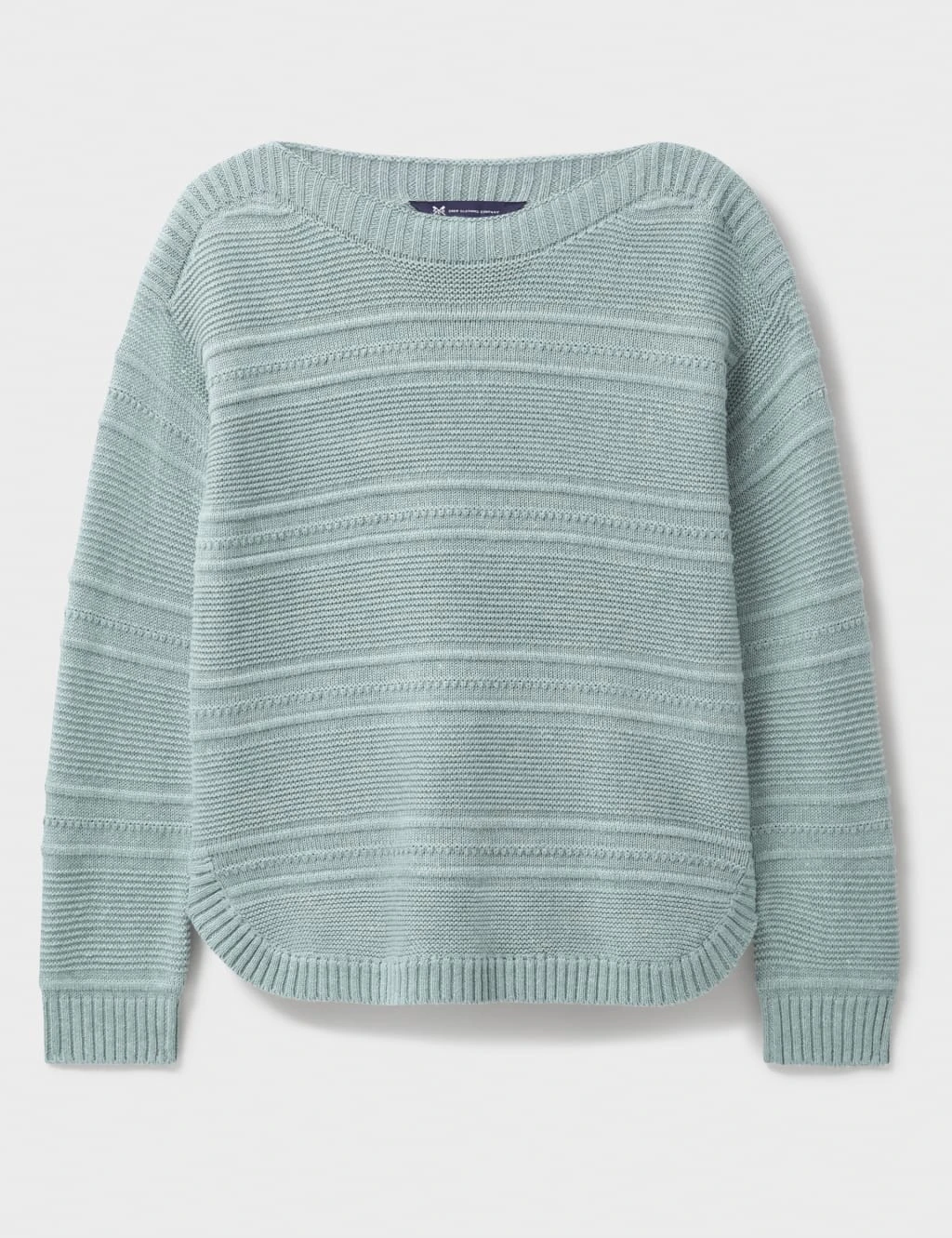 Striped stitching adds an elegant touch of texture to this cotton-blend jumper from Crew Clothing. For effortless style, it’s knitted to a timeless regular fit with ribbed trims and slouchy dropped shoulders. The rounded hem and wide slash neckline ensure a flattering, feminine shape.