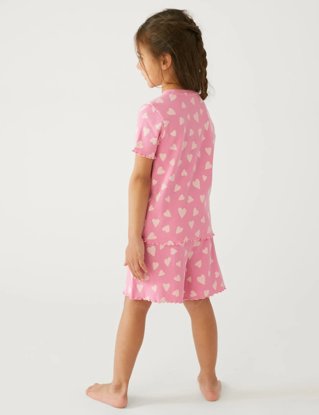 These sweet, cotton-rich pyjamas will inspire lots of happy dreams. Regular fit, with added stretch for comfort. Includes a short-sleeved top and a pair of shorts. Crafted from a comfortable ribbed material and decorated with lettuce hems and a cute print of scattered hearts.