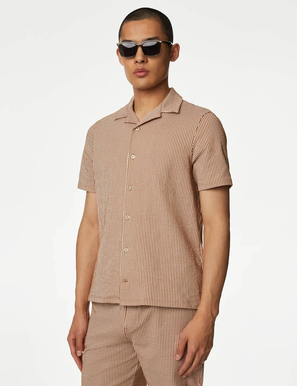 This cotton-rich jersey polo shirt is ideal for warmer days and summer nights. Easy regular fit, with added stretch for extra comfort and easy movement. Contemporary revere collar and a neat button fastening. Seersucker stripes add timeless appeal.