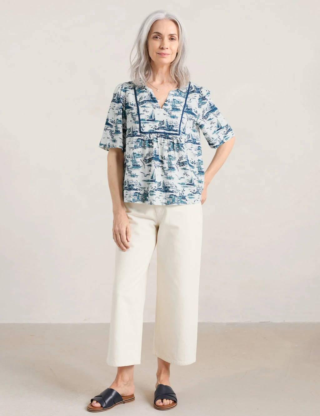 This cotton-rich blouse by Seasalt Cornwall captures a quintessential Cornish coastal scene. It’s cut in an easy regular fit, with soft gathers through the front emphasising its drapey shape. The v-neckline is beautifully framed by squared ribbon trims. Subtle pleats at the shoulders add floaty movement to the short sleeves.
