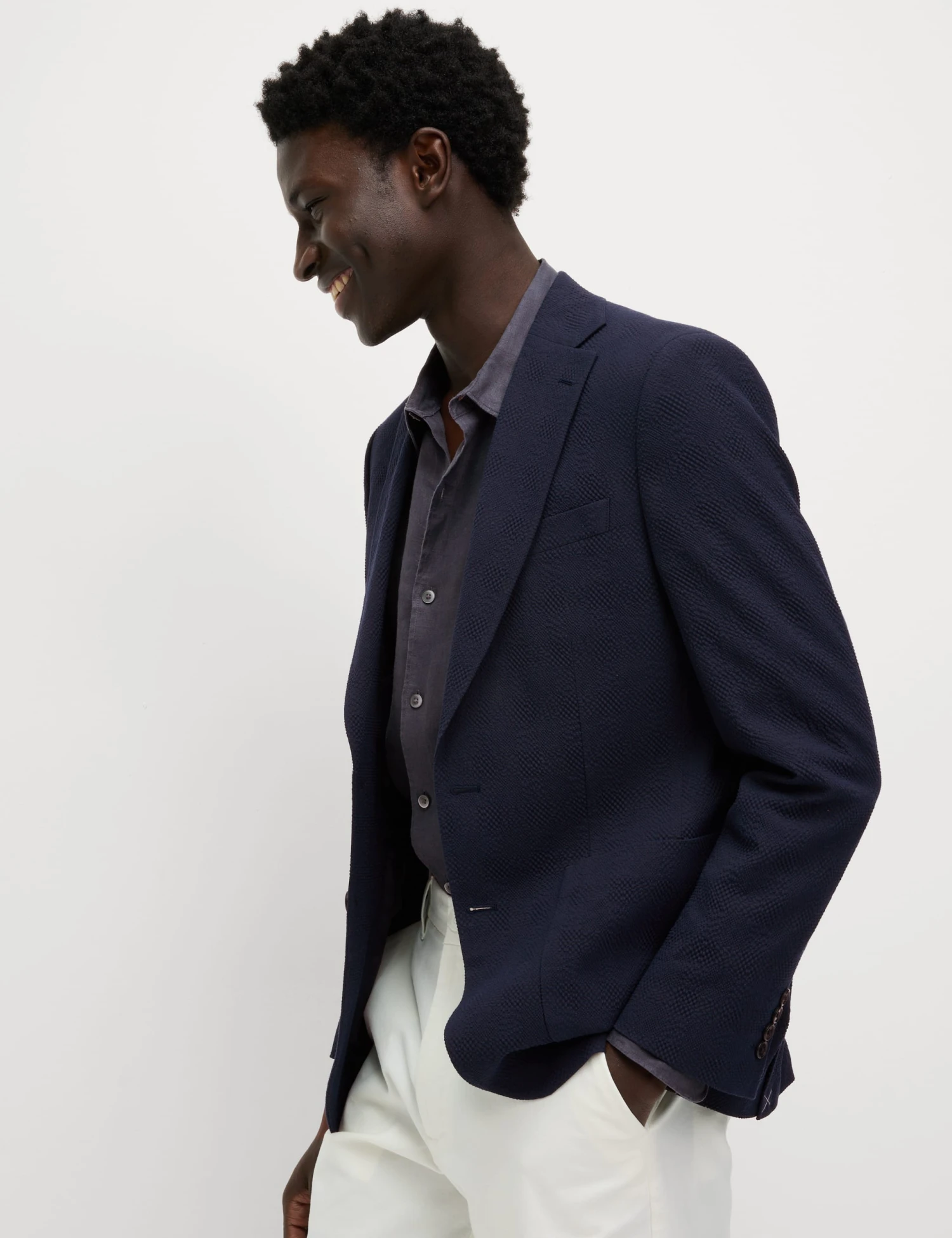 With its subtly textured seersucker fabric, this cotton-rich blazer will make a stylish addition to your smart wardrobe. It’s cut to a sleek tailored fit with added stretch for comfort. A single-breasted front and two-button fastening offer timeless appeal, while flap pockets at the waist add a practical touch. M&S Collection: easy-to-wear wardrobe staples that combine classic and contemporary styles.