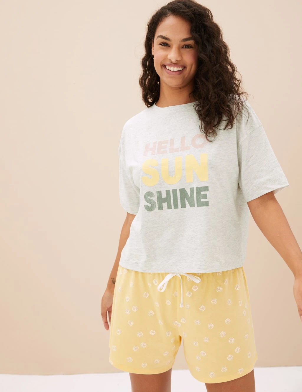 With its ‘Hello Sunshine’ slogan, this cotton-rich pyjama top will bring cheer to your nightwear collection. Comfy regular fit, with a classic round neck and short sleeves. M&S Collection: versatile styles in modern shapes with unique and playful details.