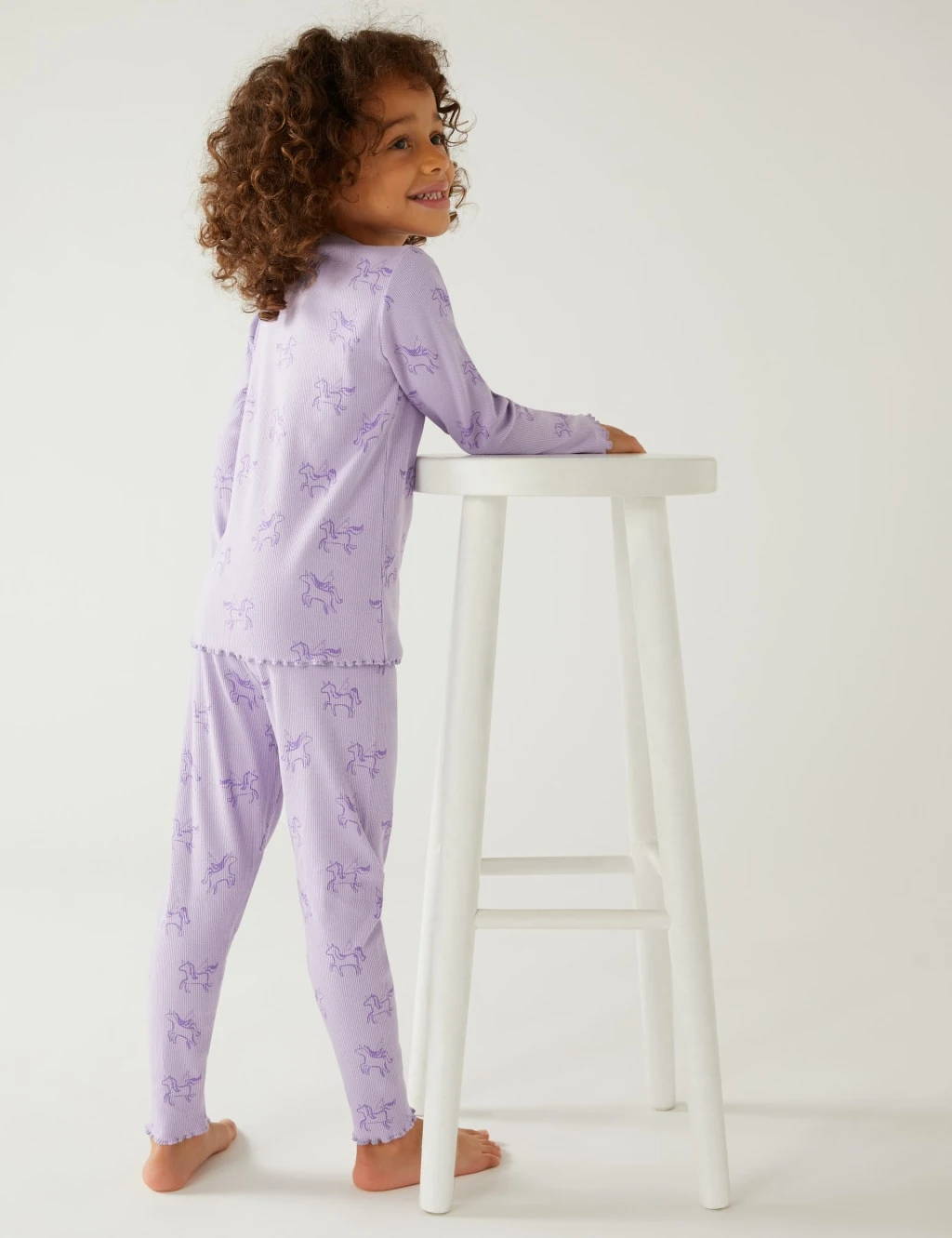 Bring a magical feel to bedtime with these cotton-rich pyjamas, featuring an all-over unicorn print. Easy regular fit with added stretch for easy movement. Made from a soft ribbed fabric to keep them cosy and comfortable all night long. We only ever use responsibly sourced cotton for our clothes.
