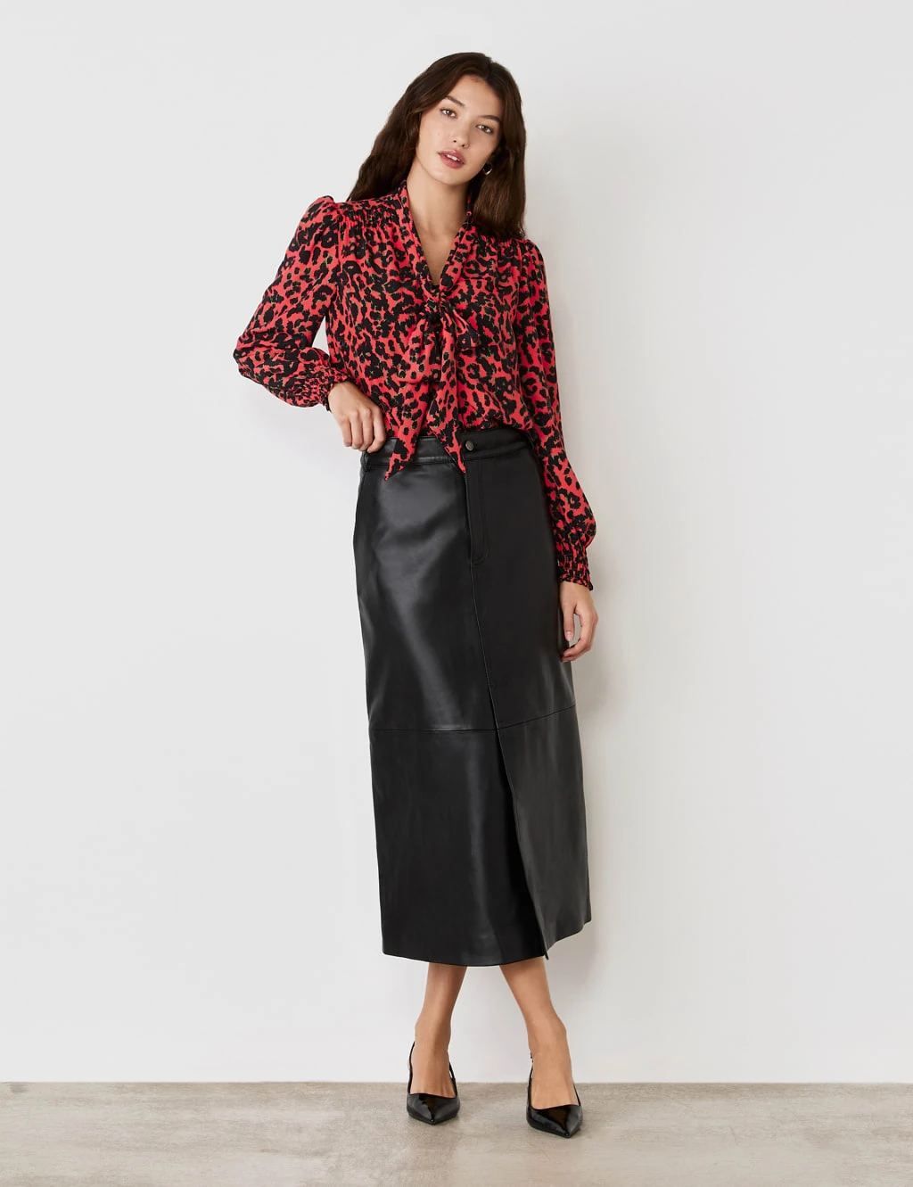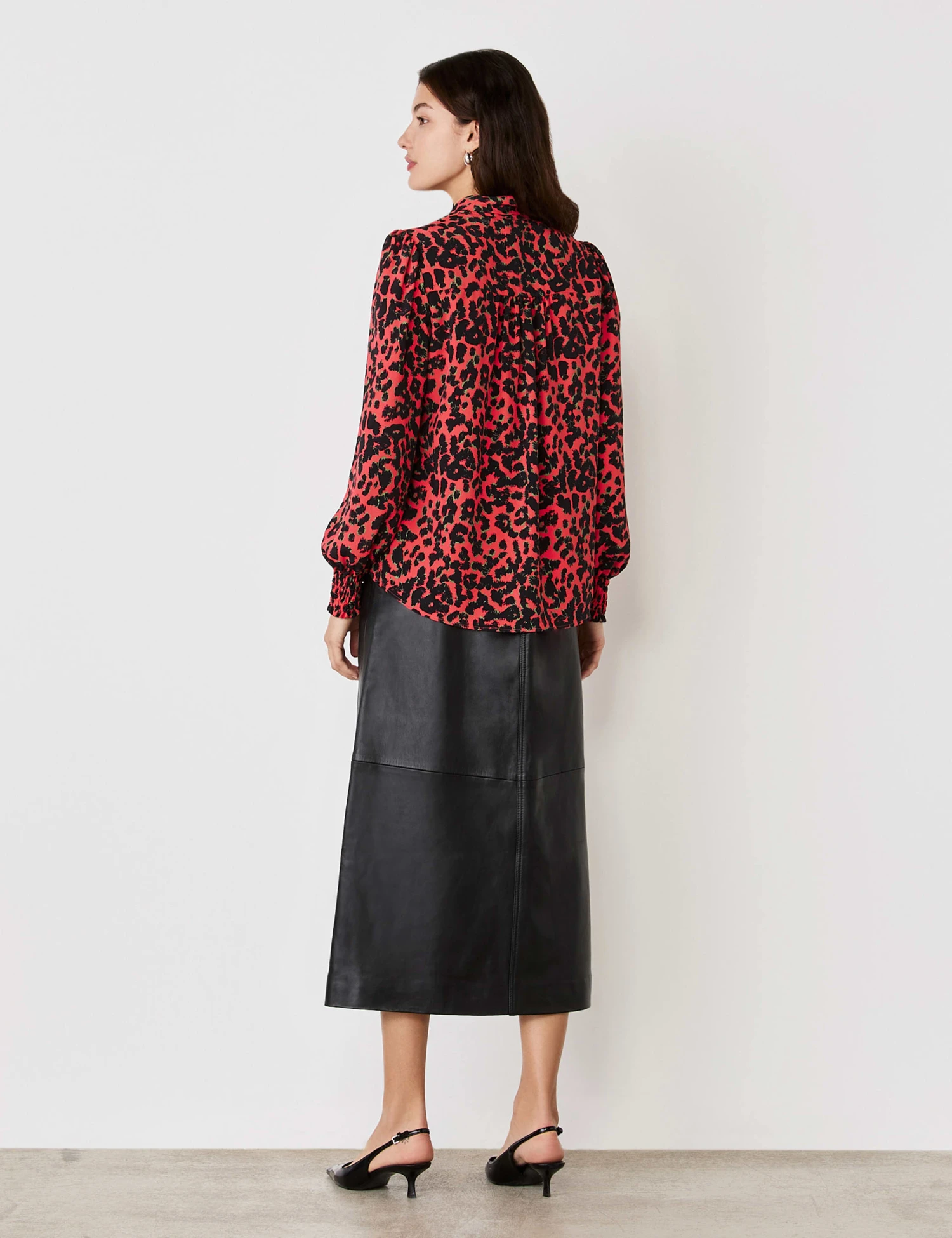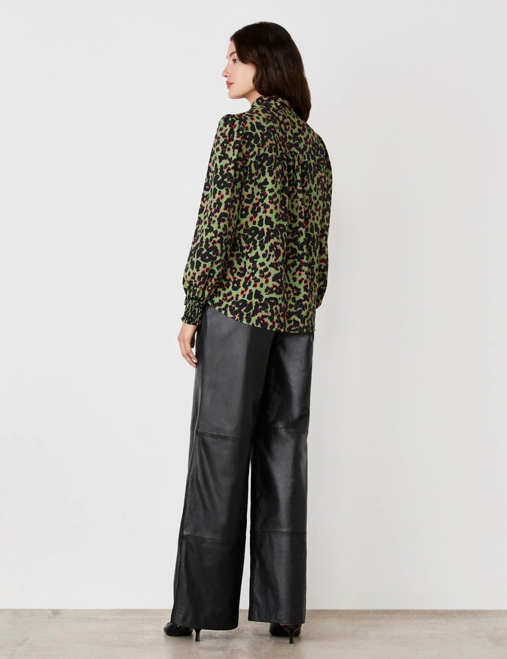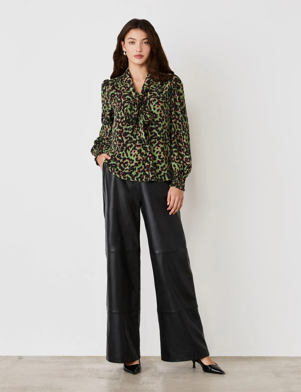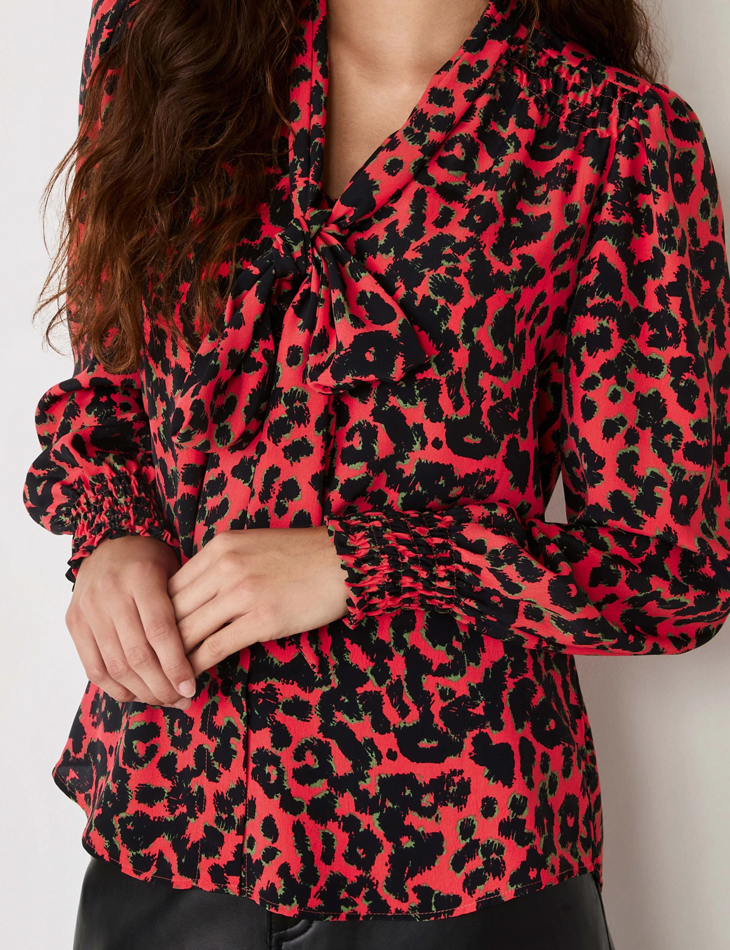 A bold animal print and feminine detailing combine in this crepe blouse from Finery London. It’s made in a regular fit, with a tie neck that can be worn in a pussy bow or left loose. Shirring features at the shoulders and the cuffs of the long blouson sleeves. This style is complete with a button-through front and a curved hem.