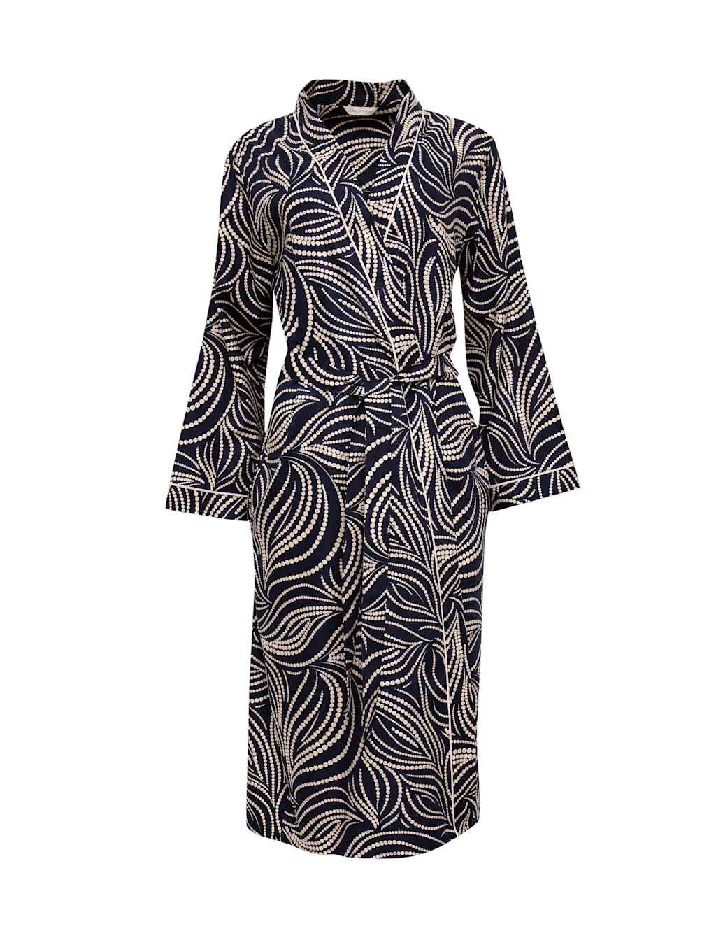This cotton-modal dressing gown by Cyberjammies is covered with an elegant spot print for luxurious evenings. This kimono style features a wrap front secured by a self-tie belt. Two practical side pockets keep essentials close at hand.