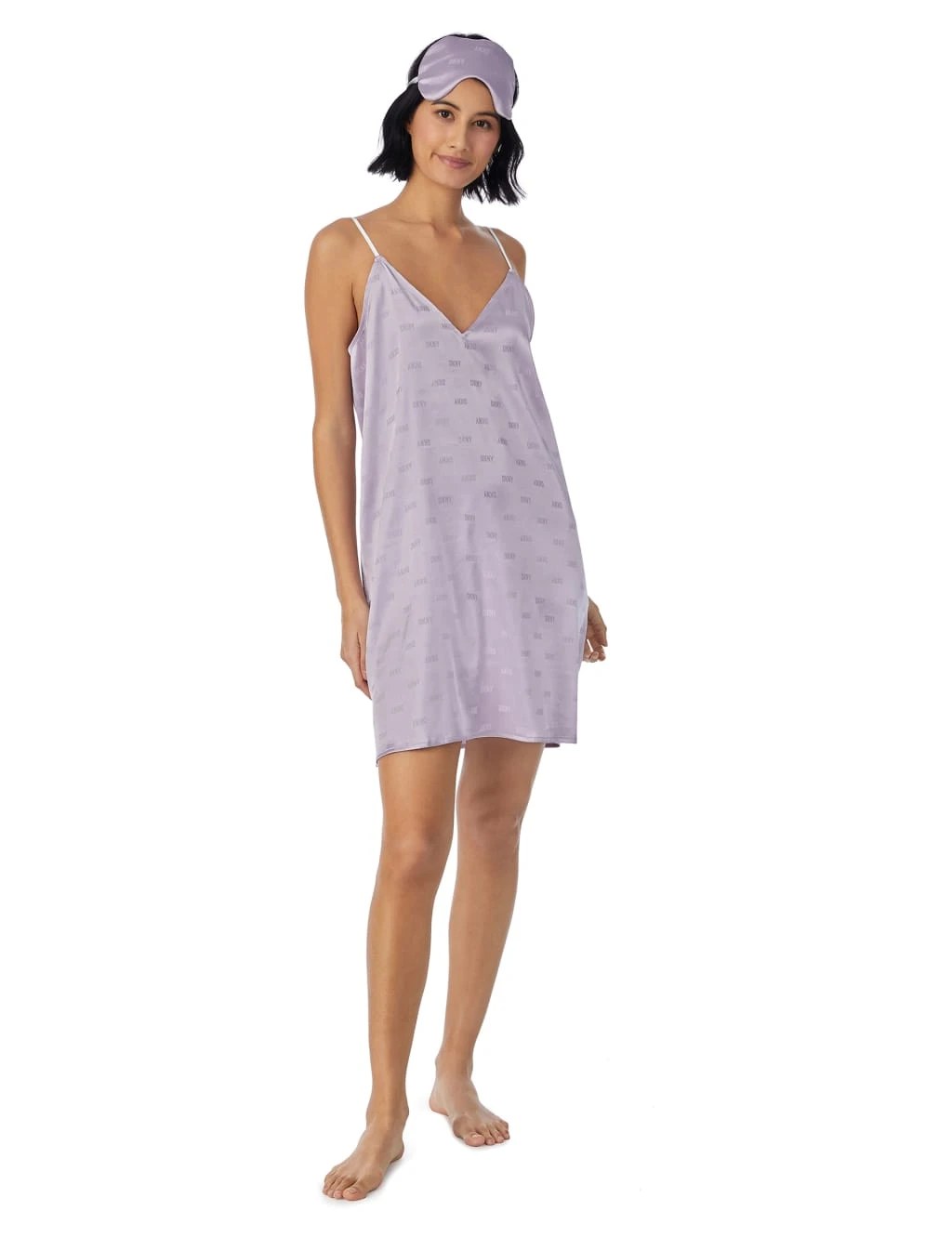 Bring a stylish feel to bedtime with this jacquard satin nightwear set from DKNY. The short chemise is cut in an easy regular fit, with adjustable straps for your comfort. Neat trims and all-over branded decoration complete the luxurious look. Ensure a good night’s sleep by blocking out the light with the matching eye mask.