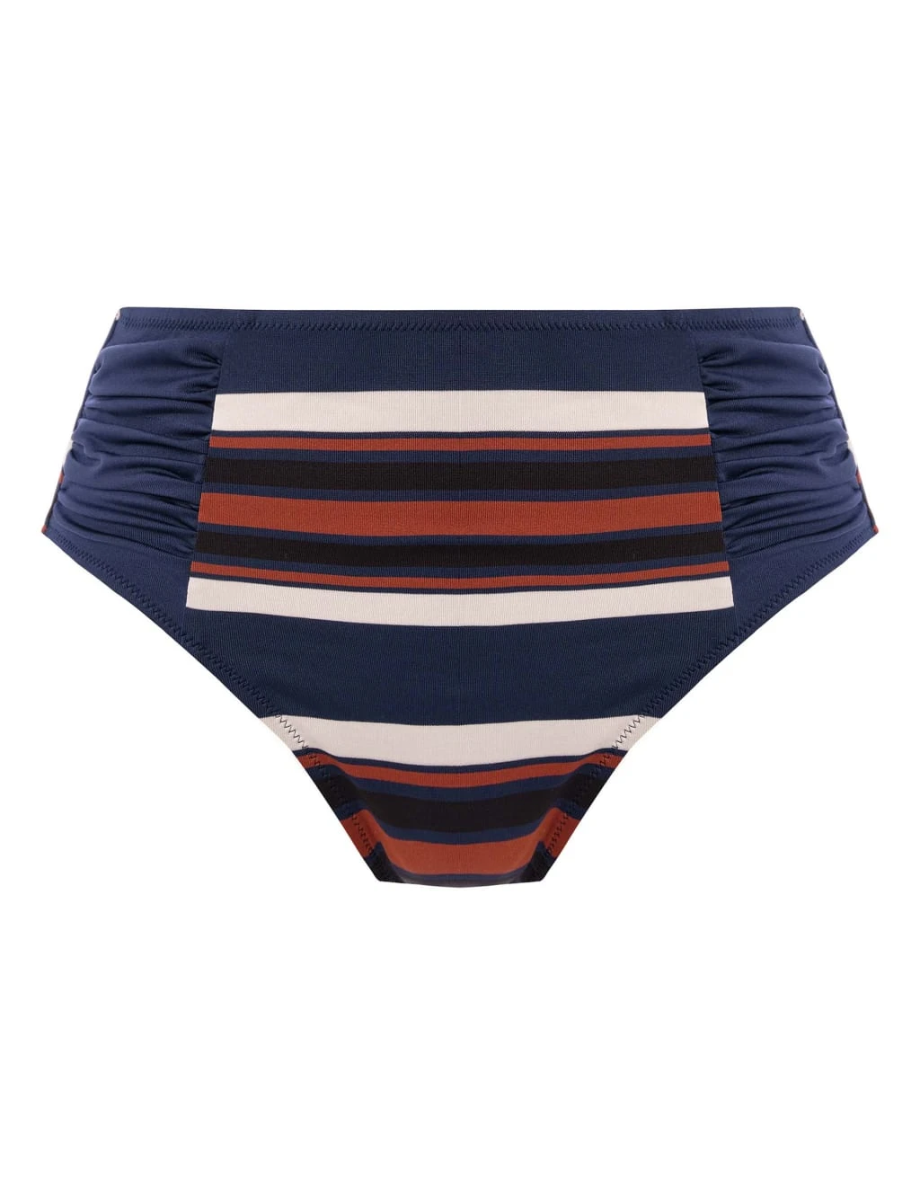 These stylish bikini bottoms from Fantasie are crafted from Spanish knitted fabric for a soft feel. They’re cut with a high-rise waist and high leg for a flattering silhouette and feature ruched sides for a vintage-inspired look. The striped front and back add a jaunty touch.