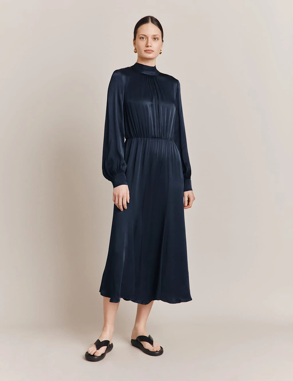 Look perfectly polished on any occasion with this elegant waisted dress by Ghost. The piece is cut in a regular fit, with a back zip fastening. A high neck brings a refined touch, while cuffed blouson sleeves offer elegant coverage. The gently gathered skirt falls to a flattering midi length.