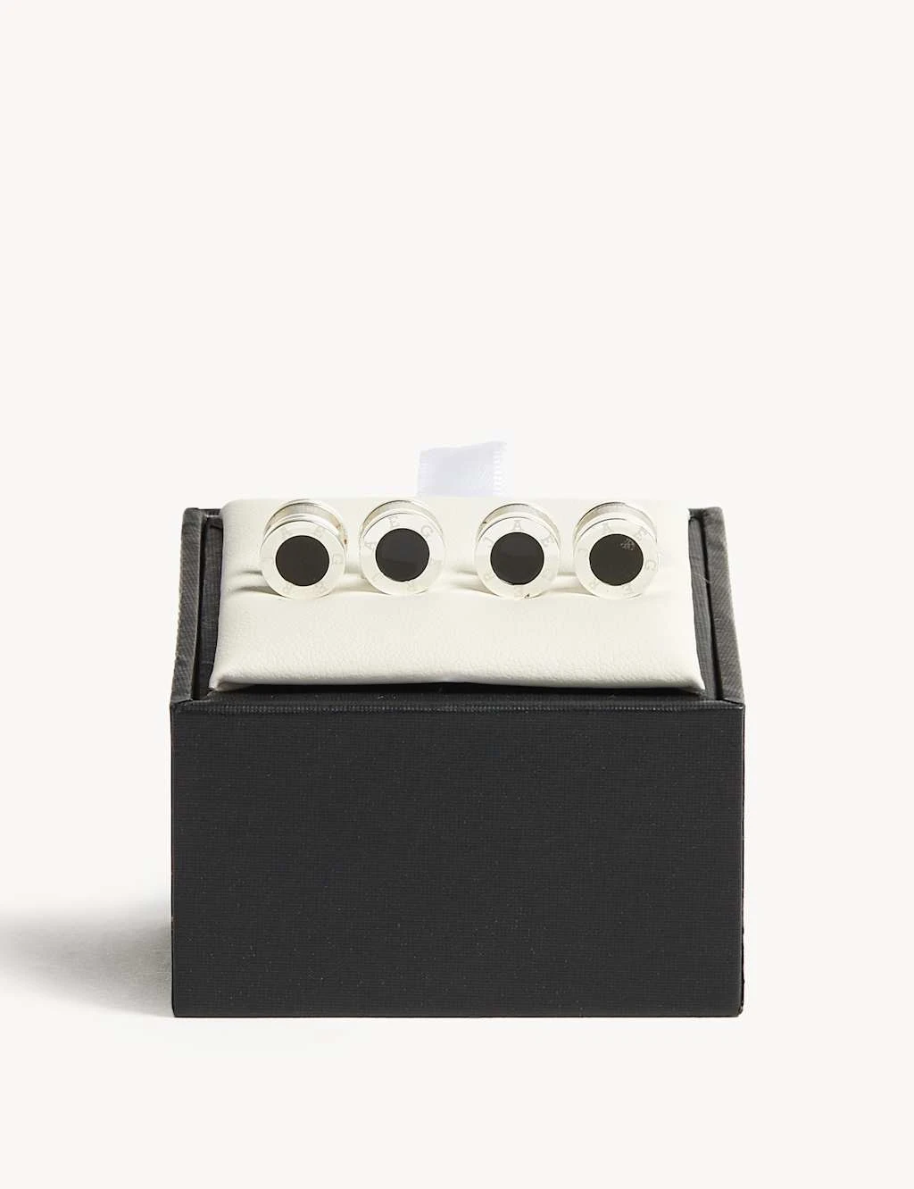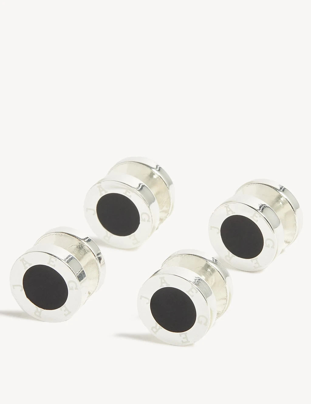These silver-plated dress studs from Jaeger will make the perfect addition to your formal eveningwear. Their round shape design features a black centre with subtle branding around the edges.