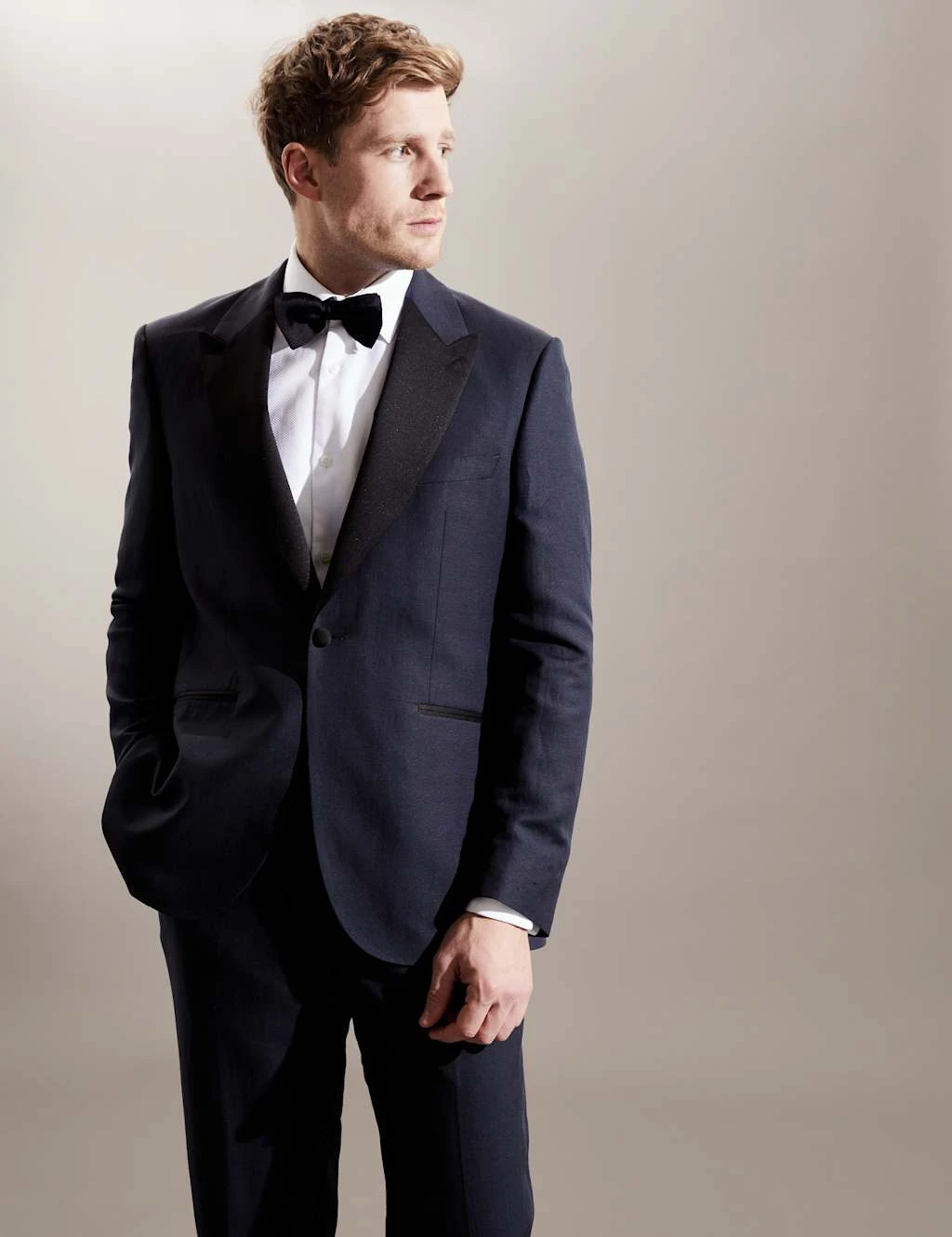 Exude style and sophistication in Jaeger’s luxurious tuxedo jacket, crafted from a fine linen and silk blend sourced from Italy’s Nova Fides mill. It’s expertly cut to a tailored fit, with a half-canvas construction for a lighter feel and the ability to mould to the body. Working buttoned cuffs and double vents take care of the refined tailored touches, while contrasting satin trims deliver black-tie elegance. Inside, the brand’s jacquard buggy lining creates a silky feel. Bound seams and Columbia stitching ensure long-lasting quality. A crisp white shirt and a dark-coloured bow tie will perfectly complement this jacket’s polished aesthetic.