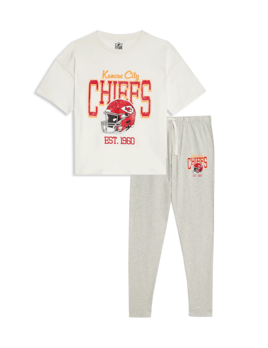 Aspiring NFL fans will love lounging around in these pure cotton pyjamas. They’re cut in a regular fit and feature a crew neck t-shirt and full-length bottoms with a comfy elasticated waist. A standout Kansas City Chiefs logo on the top and the bottoms ensures a sporty finish.