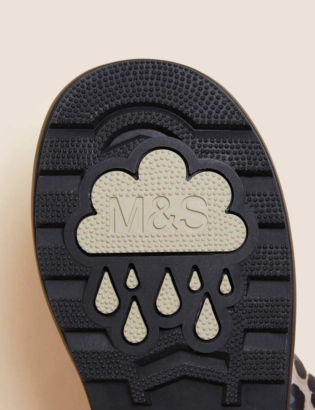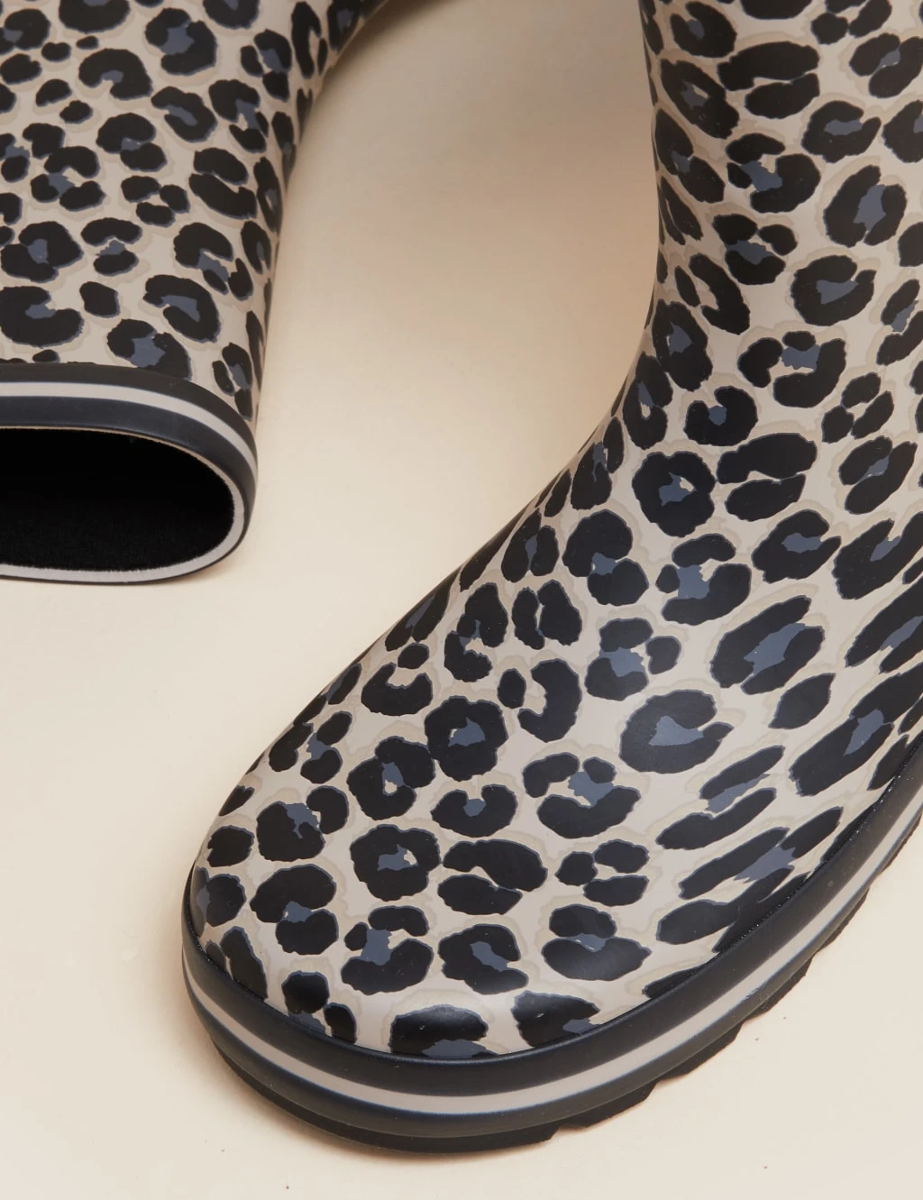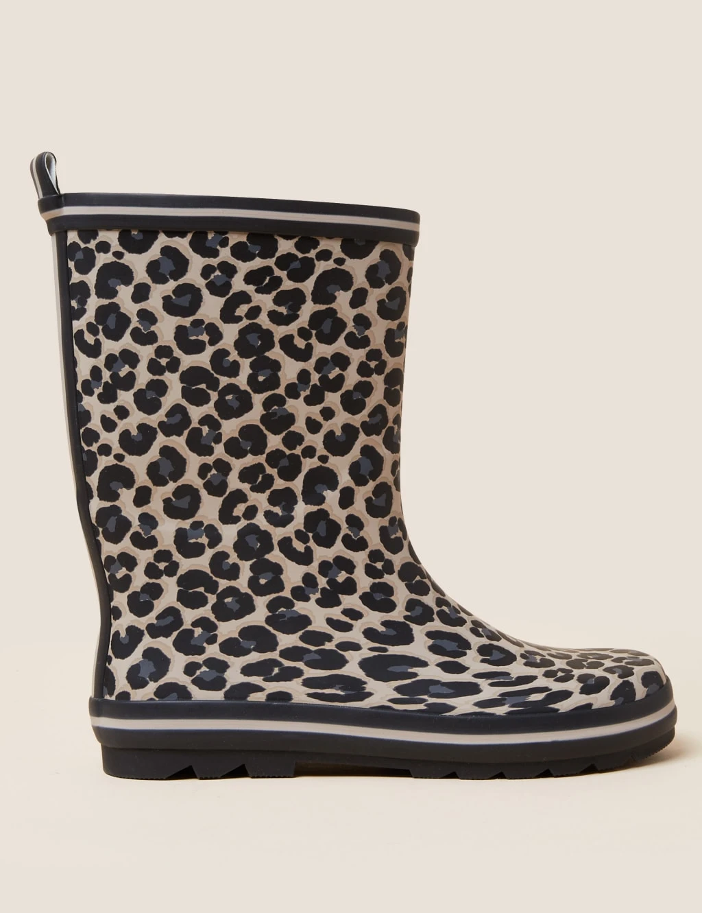Let youngsters run wild with these eye-catching leopard print wellies. Easy pull-on style. Waterproof design keeps young feet dry in the rain. Finished with contrasting stripe detail on the cuffs and back tabs. This product is vegan.
