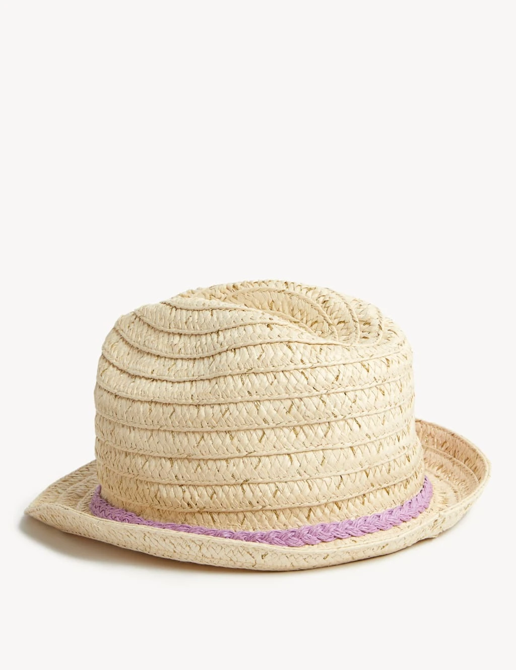 This trilby-style sun hat will keep your youngster shaded on sunny days. Embroidered raffia daisies give sweet detail and a woven braid around the brim adds a fun finishing touch.