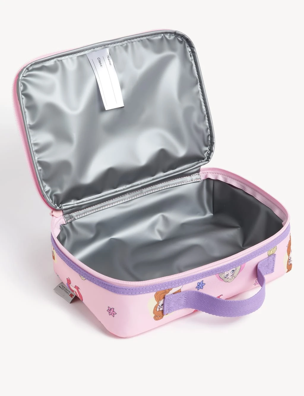 Kids can dine like royalty with this cute Disney Princess™ lunch box. Design features Mulan, Rapunzel, Belle, Moana, Aurora and Cinderella. It’s lightweight, and fastens with a zip. The seamless Thinsulate™ lining keeps food cool for longer and wipes clean easily. A machine wash gets rid of tougher stains. Name and class label inside means it’s less likely to be lost. A matching backpack is available.