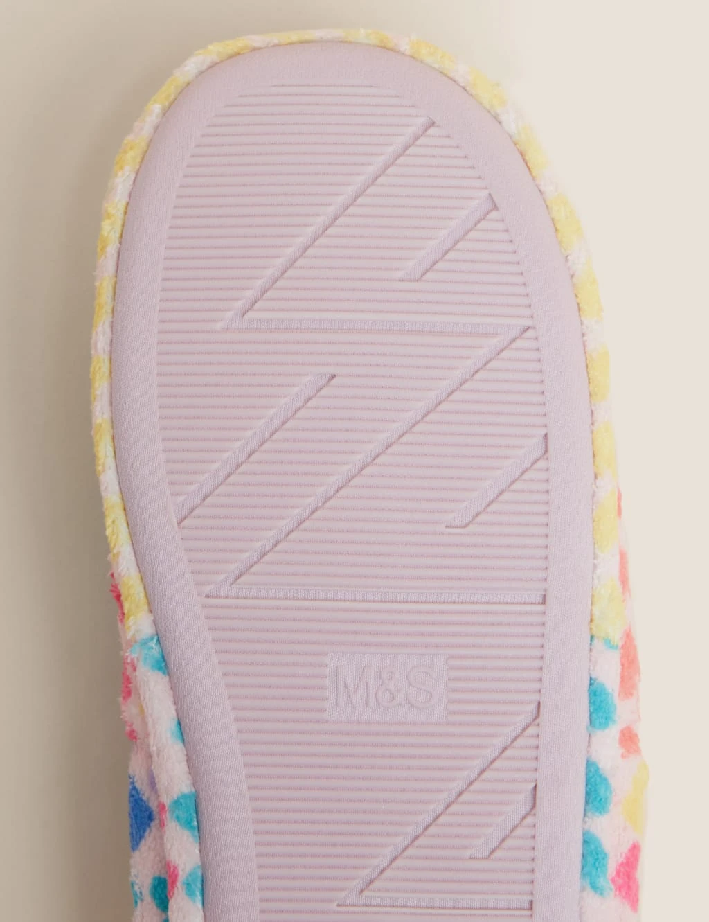 There’s a lot to love about these comfy kids’ slippers. Slip-on style that’s quick to get on and off. A cosy lining helps keep feet warm and the all-over heart print adds a colourful finish. Made with recycled polyester.