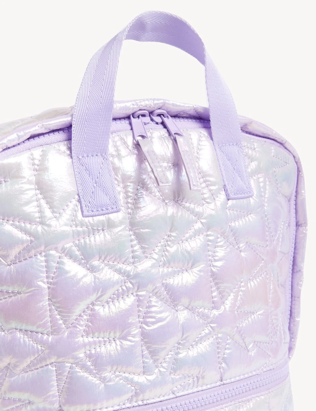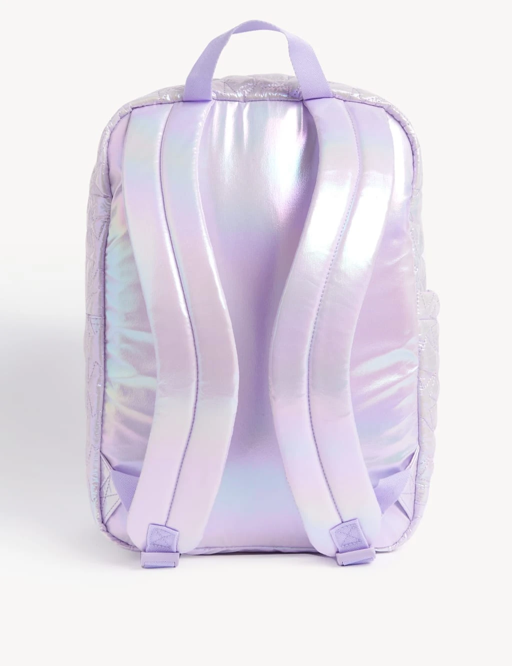 Brighten the school day with this iridescent quilted backpack. Easily fit A4 folders and a lunch box in the main zipped compartment, and a water bottle in the side pocket. Lightweight and comfortable thanks to the padded back and straps, which are curved for a better fit. Finished with a grab-and-go top handle and a name and class label on the inside.