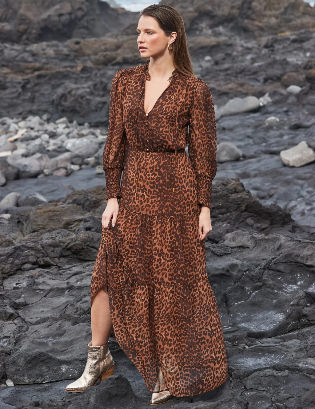 With their metallic design and croc texture, these leather ankle boots from Sosandar will bring a rock ‘n’ roll edge to any ensemble. They’re designed with a sleek pointed toe and block heel for easy walking. Western-inspired stitching on the upper adds a classic cowboy finish.