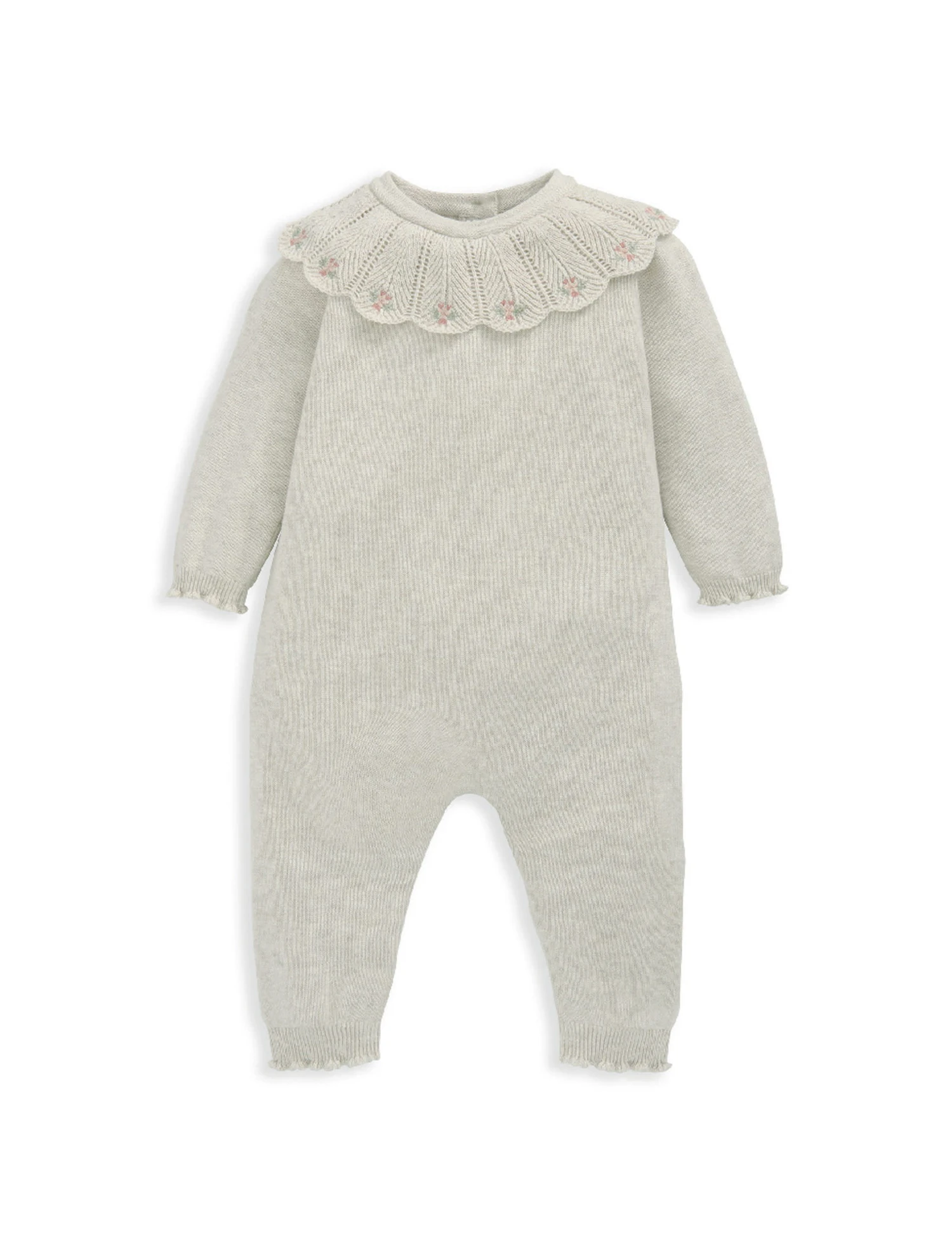Add a vintage-inspired feel to your little one’s wardrobe with this knitted, pure cotton romper from Mamas & Papas. It features a sweet scalloped collar with intricate floral embroidery, plus frilled ribbed trims on the leg and arm cuffs. This piece fastens with concealed poppers for a smart look and easy changes.