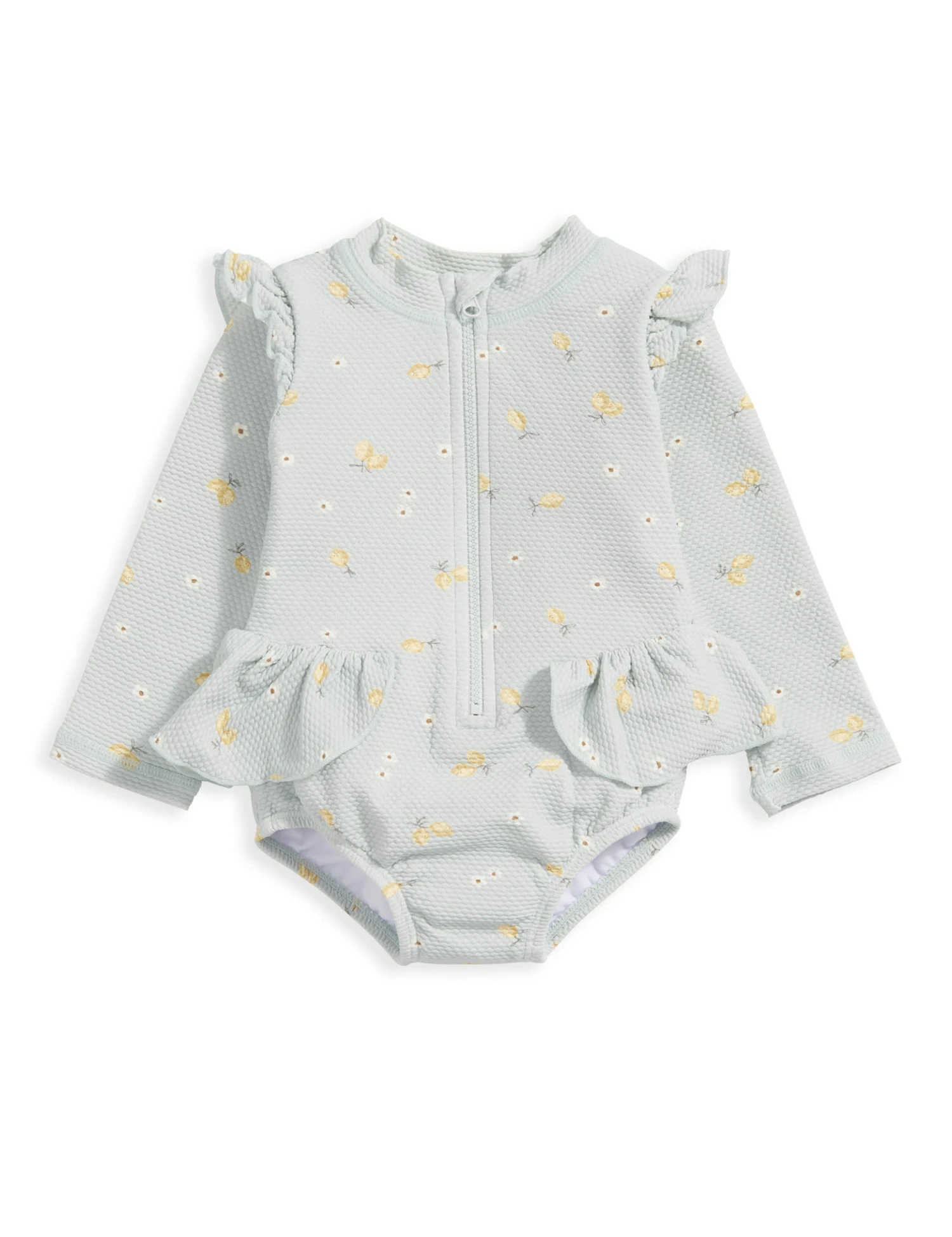 Dress them up for a fun day in the sun with this adorable lemon print swimsuit from Mamas & Papas. The long-sleeved style is made from textured fabric in a soft, stretchy design that ensures a comfortable fit. The front zip features a chin guard for softness on the skin. Frilly trims add an extra sweet touch.