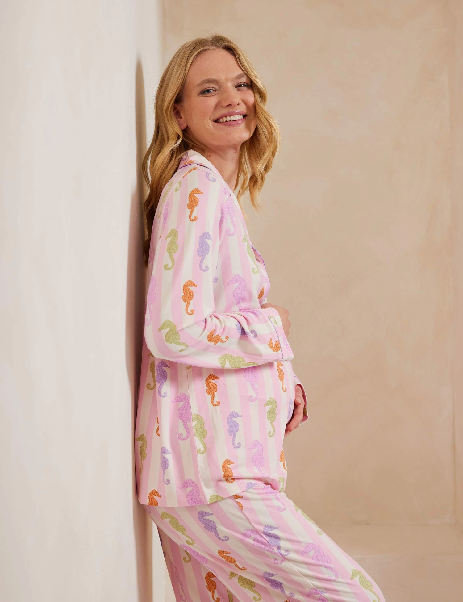 Relax in the comfort of these soft jersey maternity pyjamas from Chelsea Peers. This regular-fit set features full-length trousers with a stretchy band that sits over your growing bump. The long-sleeved shirt has an elegant revere collar and handy popper fastenings. Colourful seahorses are printed against a striped background.
