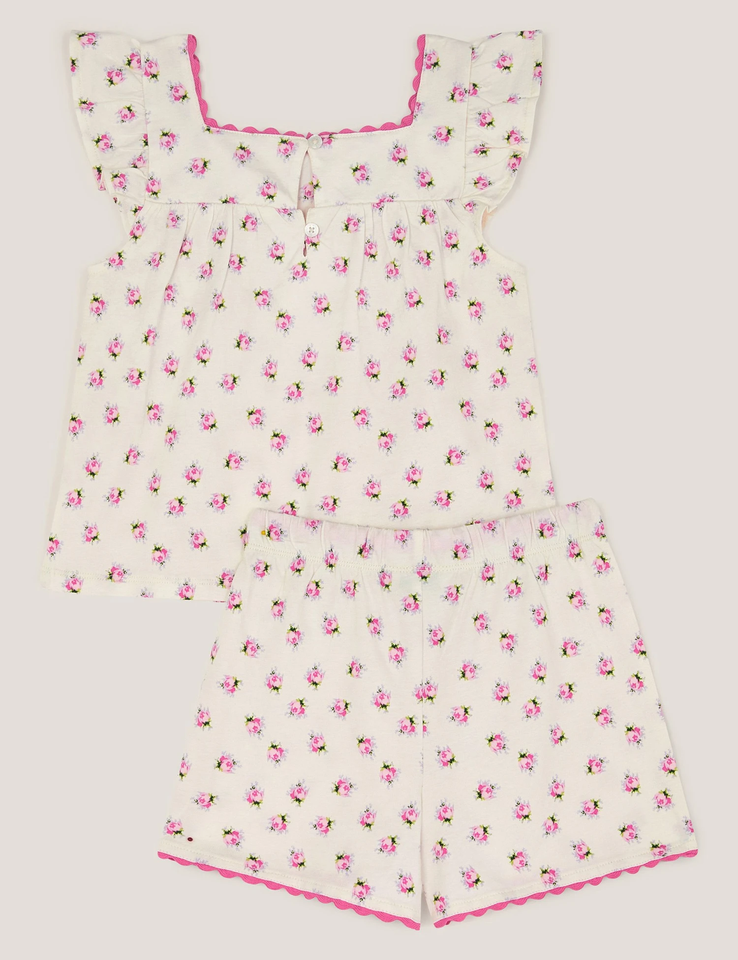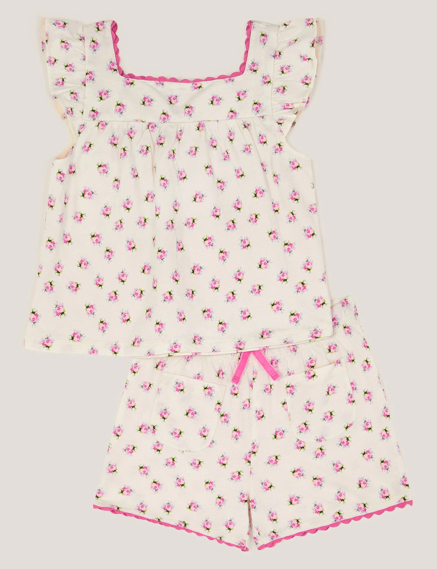 An all-over floral print gives these pyjamas by Monsoon a pretty look. They’re made in a regular fit from jersey fabric for a soft feel. The comfy top has short frilly sleeves. This set comes with matching shorts that feature two pockets and a tie waist to provide a neat finish.
