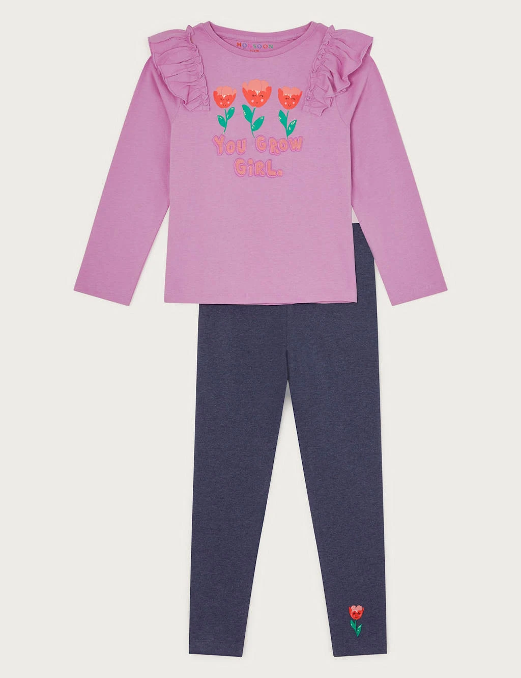 This cotton-rich outfit from Monsoon is a delightful choice for casual days. It includes a long-sleeved top with frill detailing, a floral print and fun ‘You Grow Girl’ slogan. The leggings feature an elasticated waist for comfort and a matching flower at the bottom of one leg.