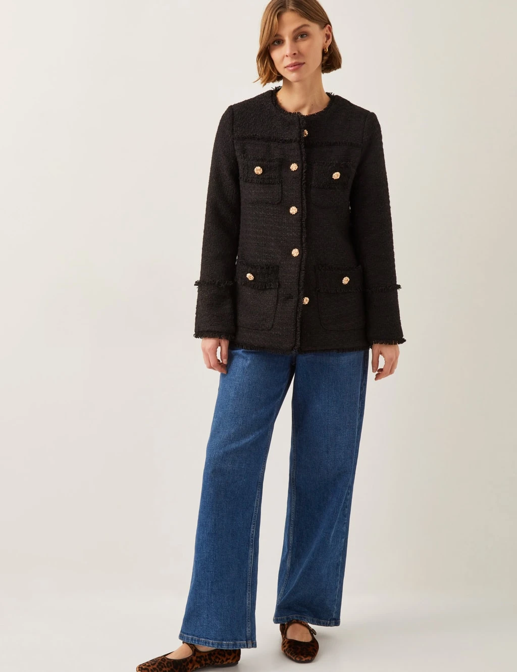 Choose this tweed blazer from Monsoon to add sophistication to smart-casual ensembles. It has an easy regular fit, with a shacket-style cut that offers a laid-back effect. The collarless neckline, hem and long sleeves are complete with frayed trims, while metallic buttons on the single-breasted front and pockets bring a lustrous finish.