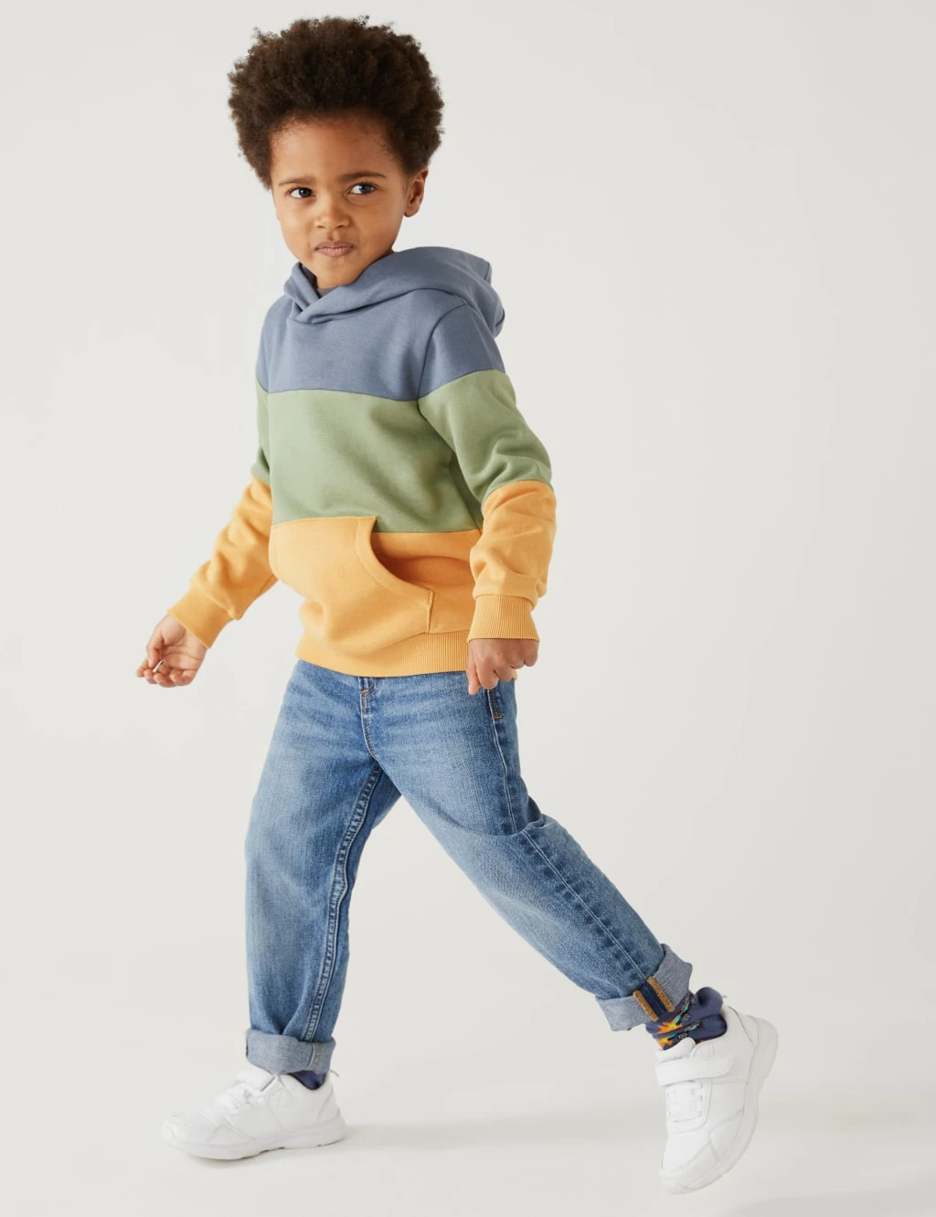With its fun colour block design, this cotton-rich hoodie is the ideal extra layer. It’s cut in a comfy regular fit, with neat ribbed trims at the cuffs and hem. The classic kangaroo pocket gives them a handy place to keep their bits and bobs.