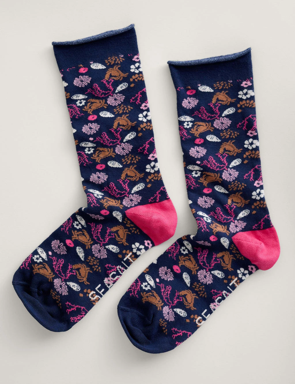 Seasalt socks featuring hand-drawn prints and cheerful designs, made from soft and breathable bamboo. They have extra comfy toe seams and rolled-edge cuffs.