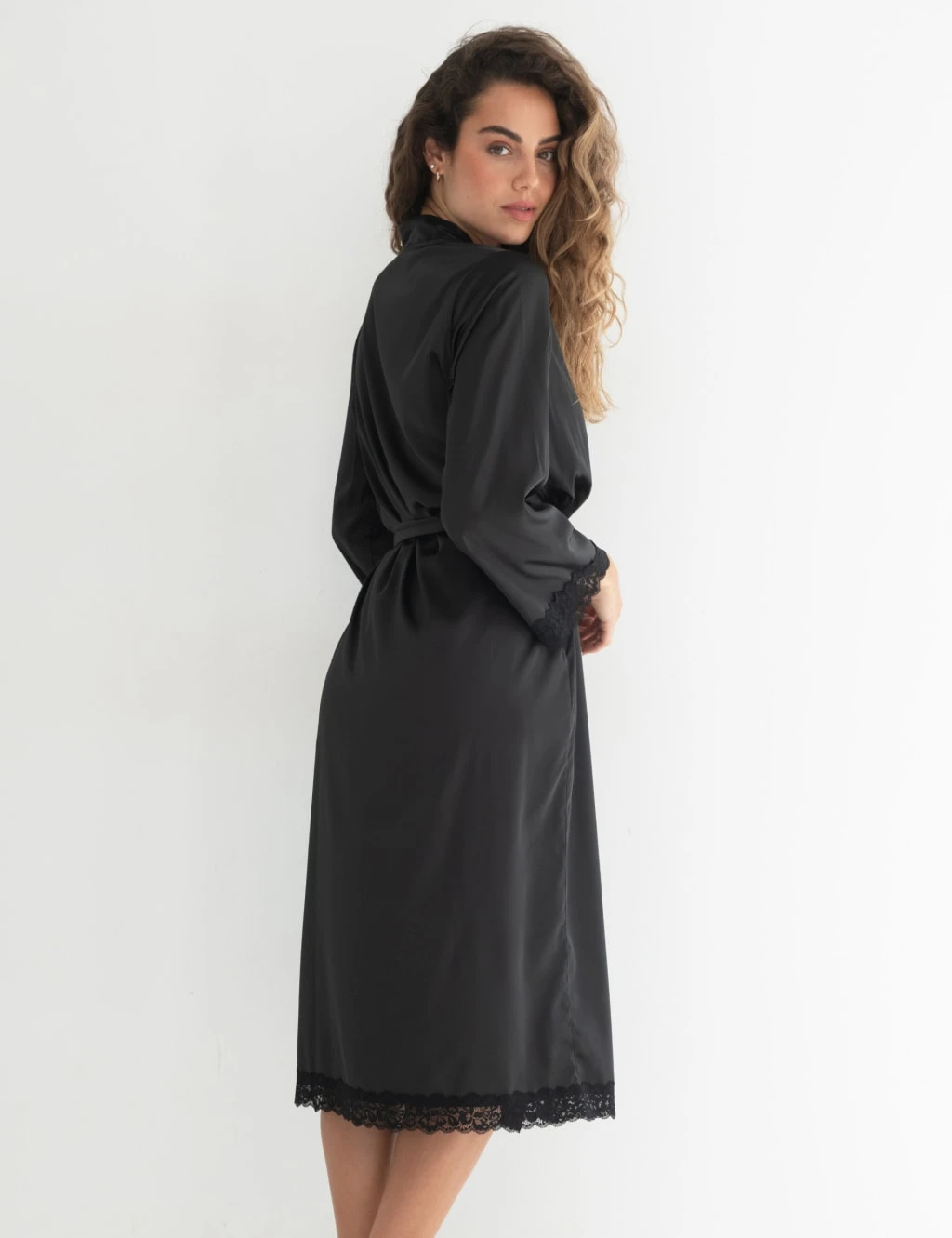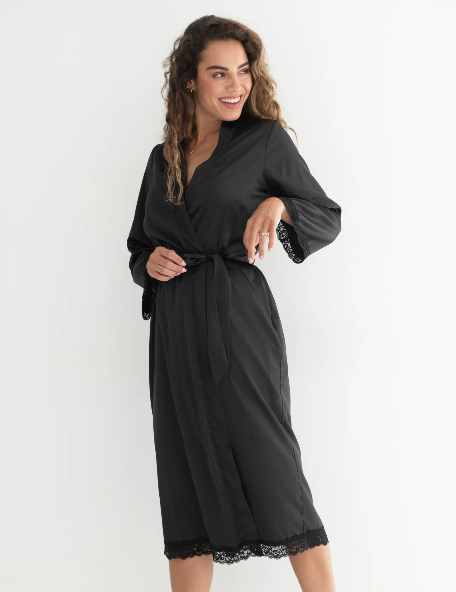 Bring a glamorous feel to your at-home lounging with this satin dressing gown by Pour Moi. This midi-length luxurious style is cut to a regular fit, with a belted waist for a flattering silhouette. Kimono sleeves with lace trim cuffs only add to its sophisticated appeal.