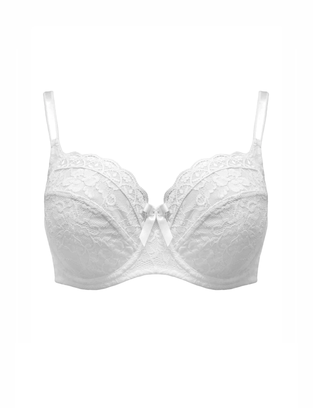 Celebrate your natural shape in feminine style and comfort with this Pour Moi bra. It offers total bust support, with wired cups and side boning creating a subtle, forward-projected silhouette without any padding. Stretch floral lace ensures all-day comfort, while bow detailing adds to the romantic feel.