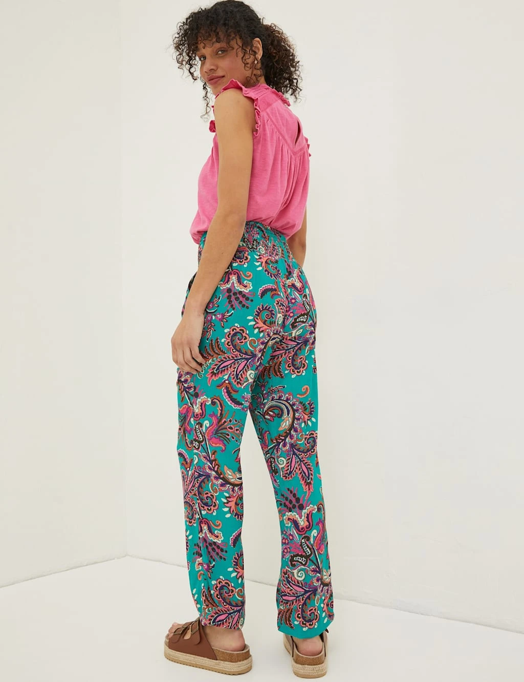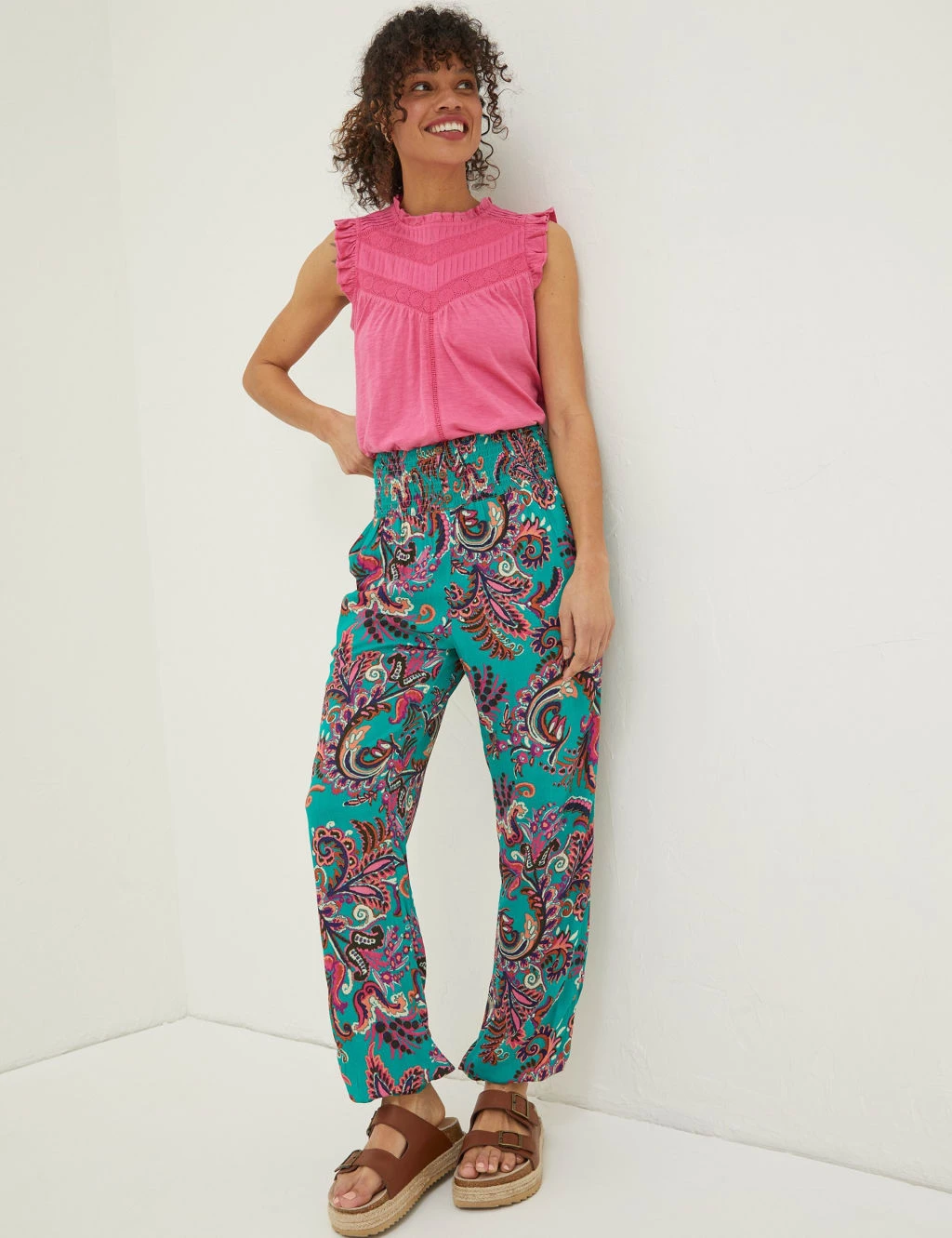 For a chilled-out feel, choose these vibrant printed trousers from FatFace. The legs have a tapered fit, ending in elasticated ankle cuffs, while the mid-rise waistband is also elasticated for stretchy comfort. A shirred panel at the waist gives the trousers a flattering fit, while three buttons add a neat finishing touch.