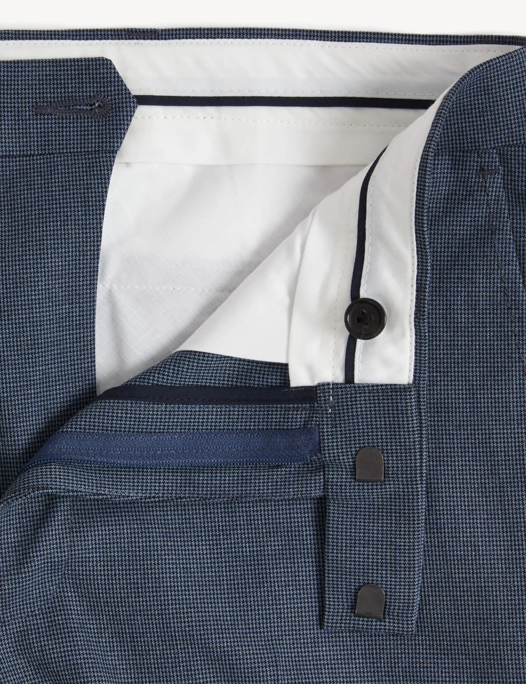 Elevate your formal wardrobe with these textured puppytooth trousers. They’re made with added stretch so they move with you. The flat front style sits low on the hips, with a French bearer button to hold the front flat for a crisp look. Half-leg kick tape gives the seams durability. The trousers are finished with double-jetted pockets.